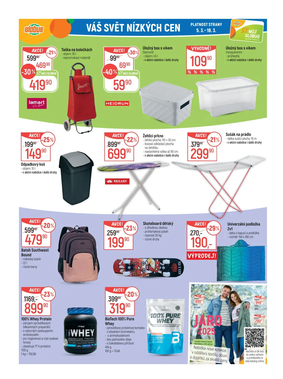 V obchodě Globus probíhá akce s nízkými cenami na široký sortiment produktů.