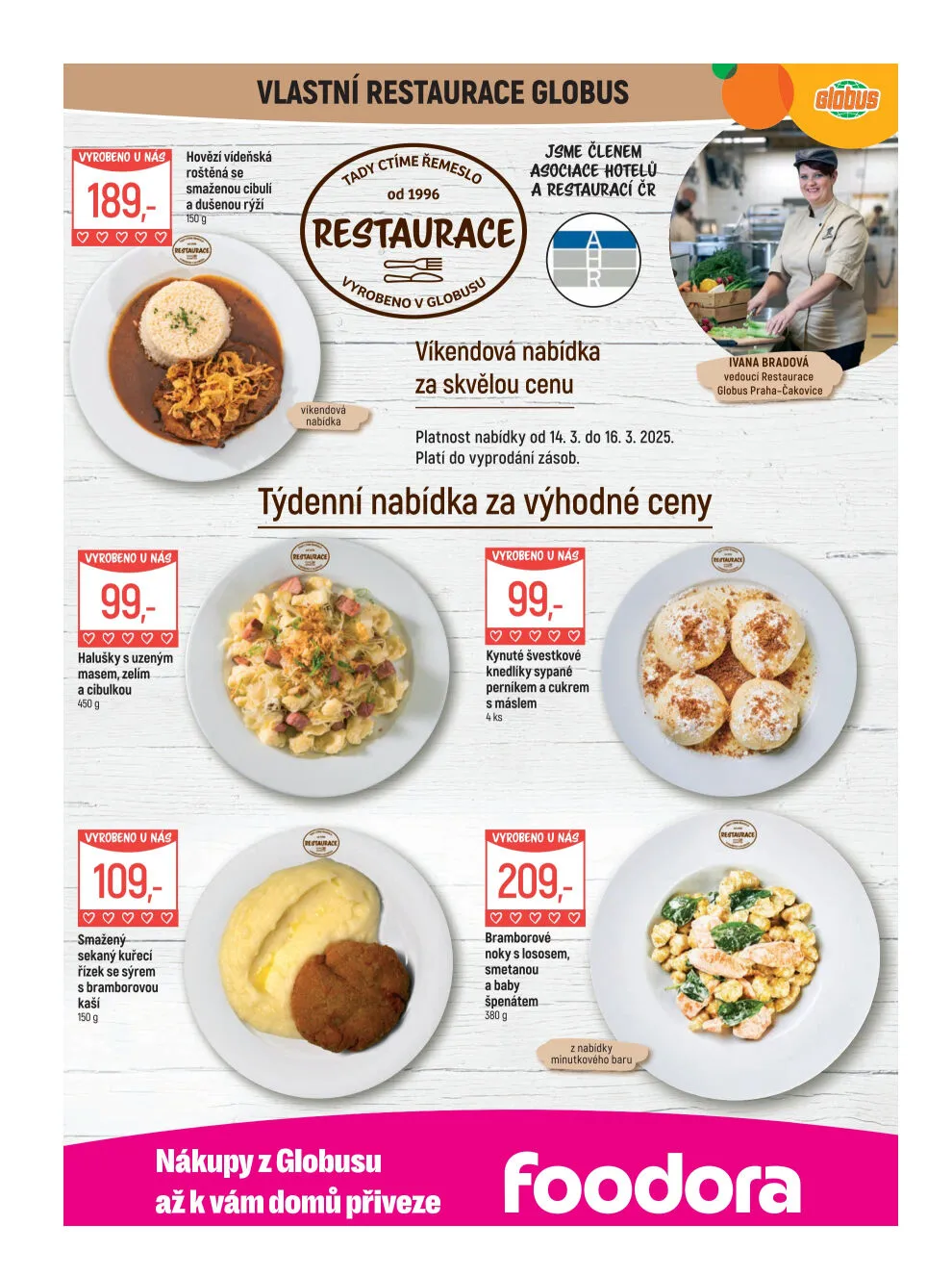 V letáku obchodu Globus najdete skvělou víkendovou nabídku s chutnými pokrmy za výhodné ceny. Mezi nabízenými produkty se objevují halušky s uzeným masem, zelím a cibulkou za 189 Kč, sekaný kuřecí řízek se sýrem a bramborovou kaší za 99 Kč, a hovězí vídeňská roštěná se smaženou cibulkou za 199 Kč. Dále si můžete pochutnat na kynutých švestkových knedlících sypaných perníkem a cukrem za 99 Kč, nebo bramborových nokách s lososem, smetanou a baby špenátem za 209 Kč. Nabídka platí od 14.3. do 16.3.2025 a je dostupná do vyprodání zásob. Nákupy z Globusu vám navíc přiveze Foodora přímo domů!