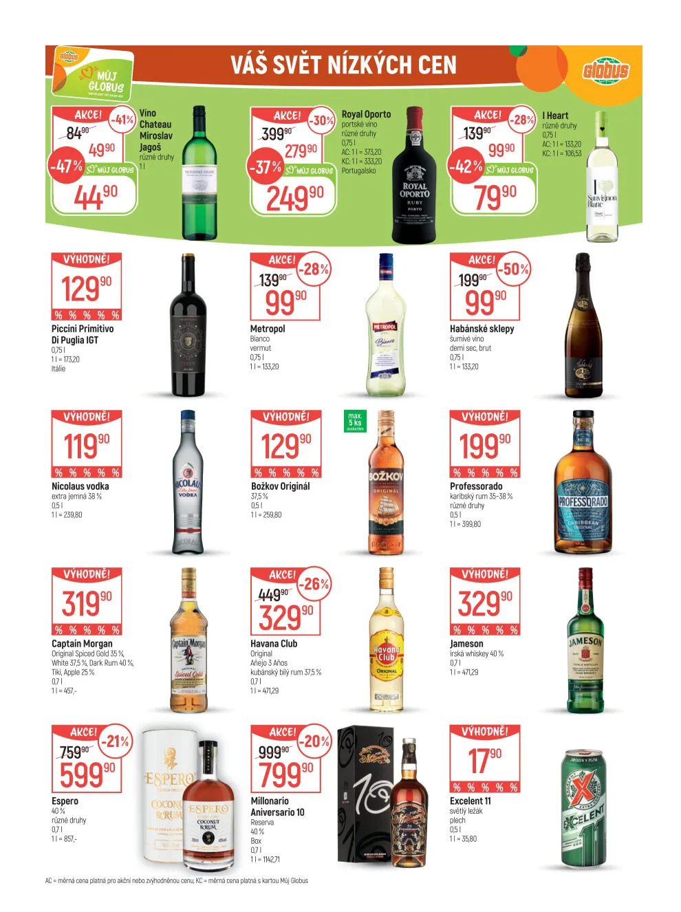 V letáku obchodu Globus najdete širokou nabídku produktů za výhodné ceny. Mezi akčními položkami se objevuje víno Piccini Primitivo di Puglia za 4490 Kč, nebo Nicolaus vodka za 11990 Kč. Pro milovníky rumu je k dispozici Captain Morgan Original za 31990 Kč a Havana Club Original za 32990 Kč.