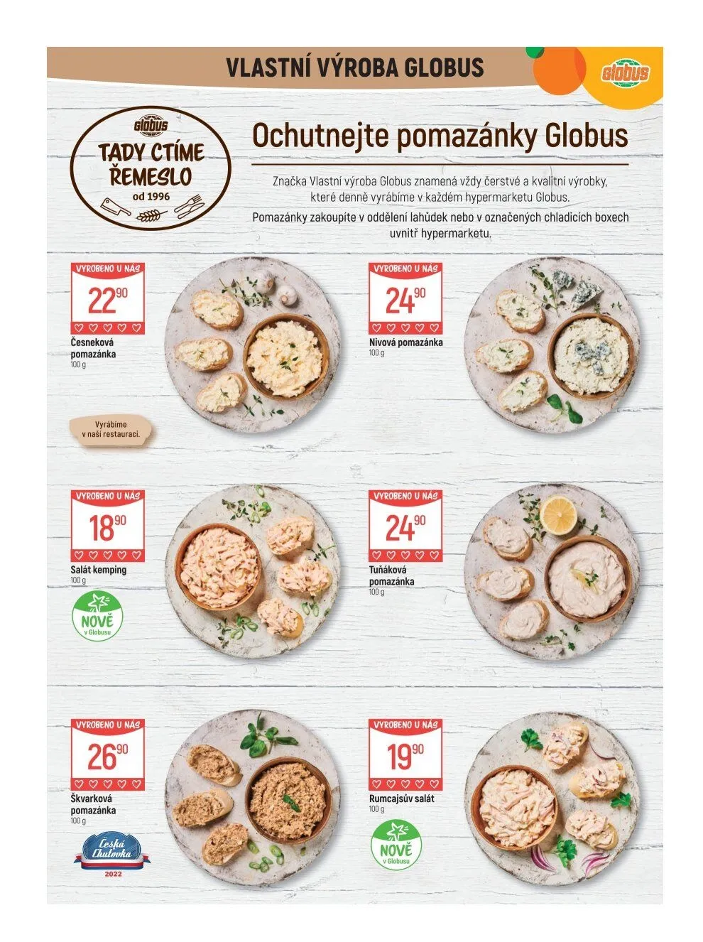 V letáku obchodu Globus najdete širokou nabídku čerstvých a kvalitních pomazánek, které jsou vyráběny přímo v našich hypermarketech. Mezi oblíbené produkty patří česneková pomazánka, škvarková pomazánka, nivová pomazánka a tuňáková pomazánka. Všechny tyto lahodné pomazánky jsou k dispozici v oddělení lahůdek nebo v označených chladicích boxech. Nezapomeňte ochutnat také náš Rumcajsův salát a salát Kemping. Všechny výrobky jsou zaručeně čerstvé a pocházejí z vlastní výroby Globus.