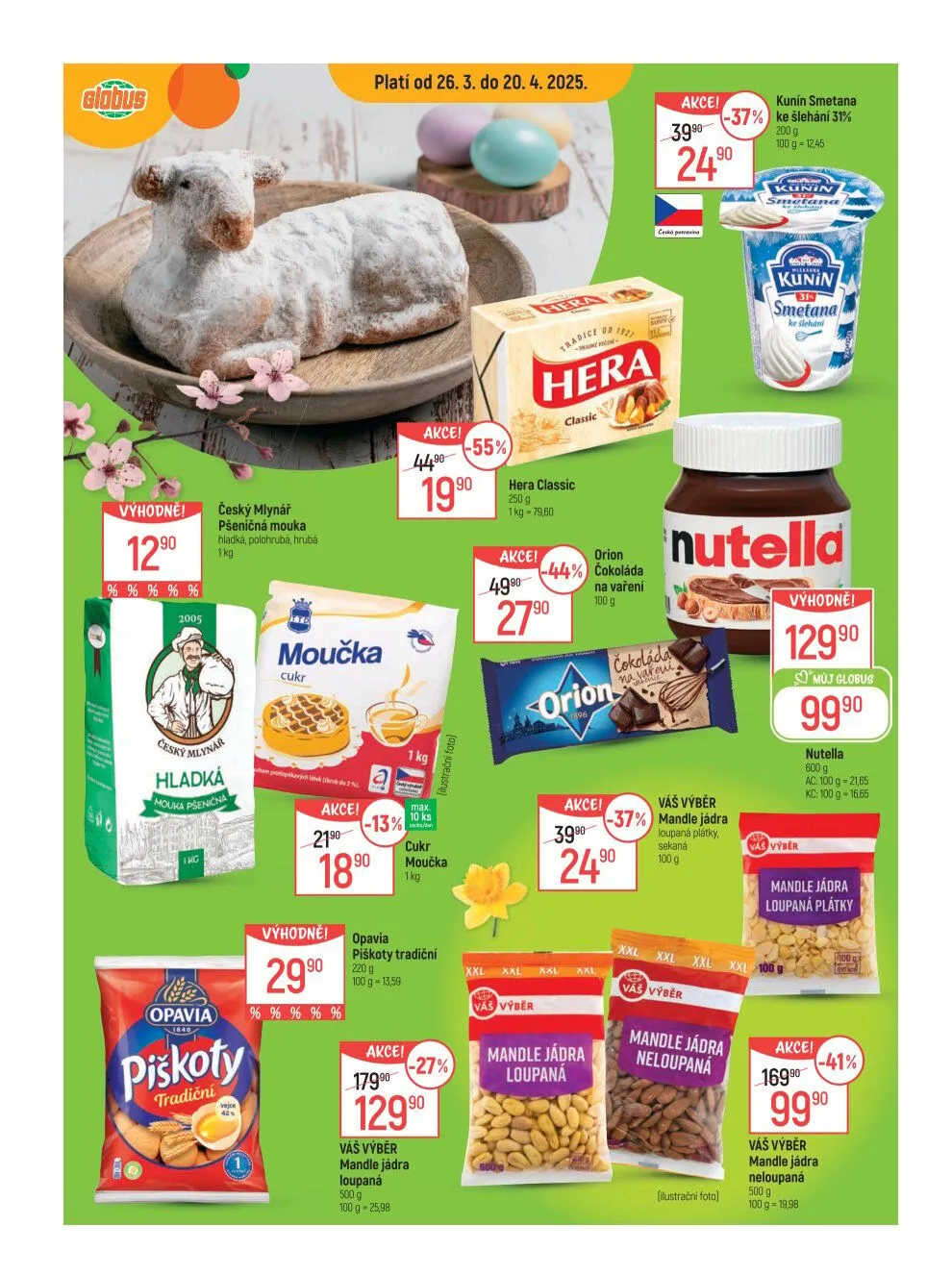 V letáku obchodu Globus najdete skvělé akce platné od 26.3. do 20.4.2025. Nabízíme například Hera za výhodnou cenu s 55% slevou. Dále si můžete pořídit Kunin smetanu ke šlehání a pšeničnou mouku od Českého mlynáře. Nezapomeňte také na čokoládu Nutella a cukr moučku od Opavia, které jsou nyní v akci. Pro milovníky mandlí máme široký výběr loupaných i neloupaných mandlí za skvělé ceny. Navštivte nás a využijte těchto výhodných nabídek!