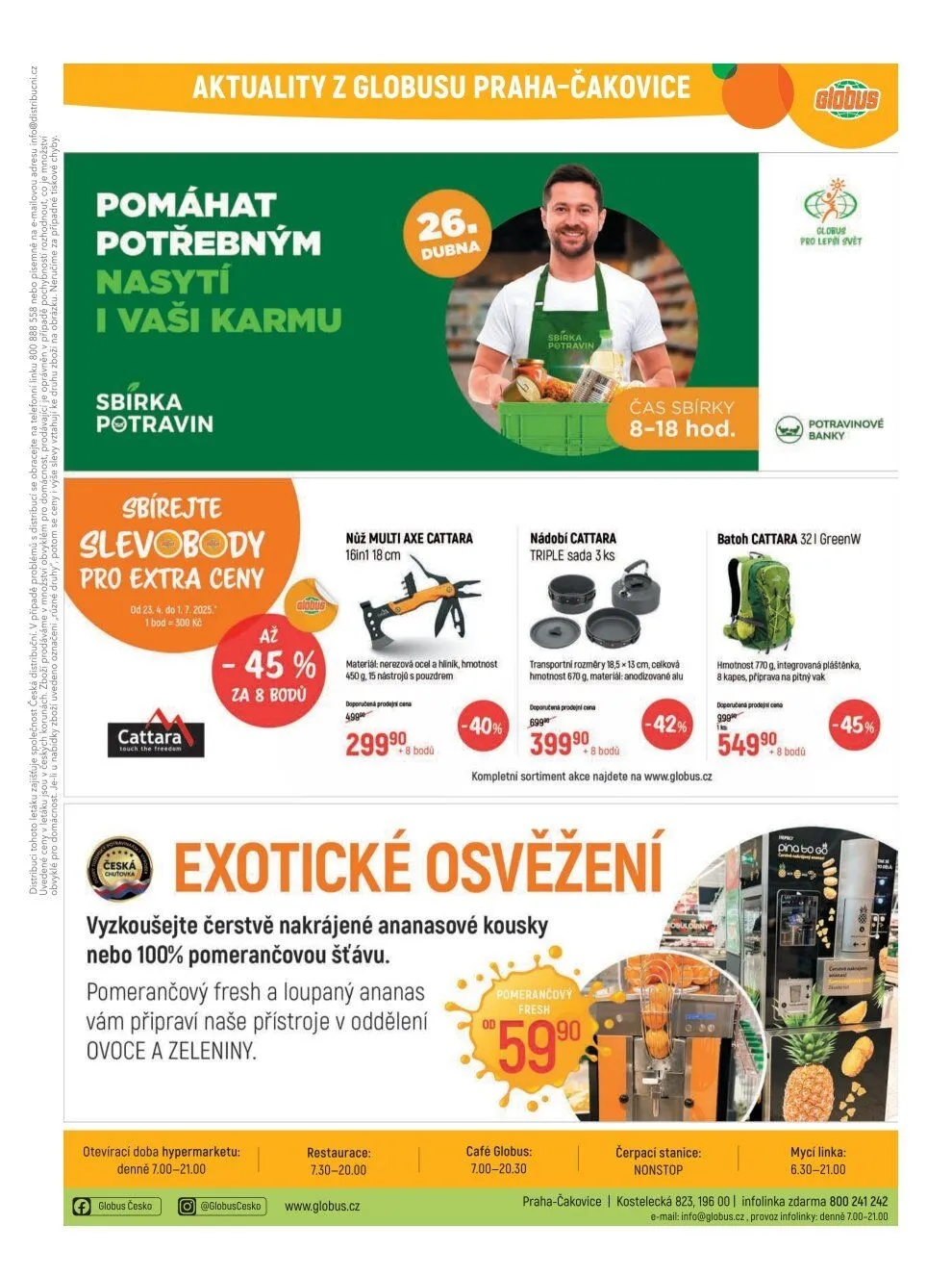 V obchodě Globus Praha-Čakovice probíhá sbírka potravin, která pomáhá potřebným a nasytí vaši karmu. Čas sbírky je od 8 do 18 hodin. V letáku najdete také skvělé akce, například nůž Multi Axe Cattara s pouzdrem a trojdílnou sadu nádobí Cattara.