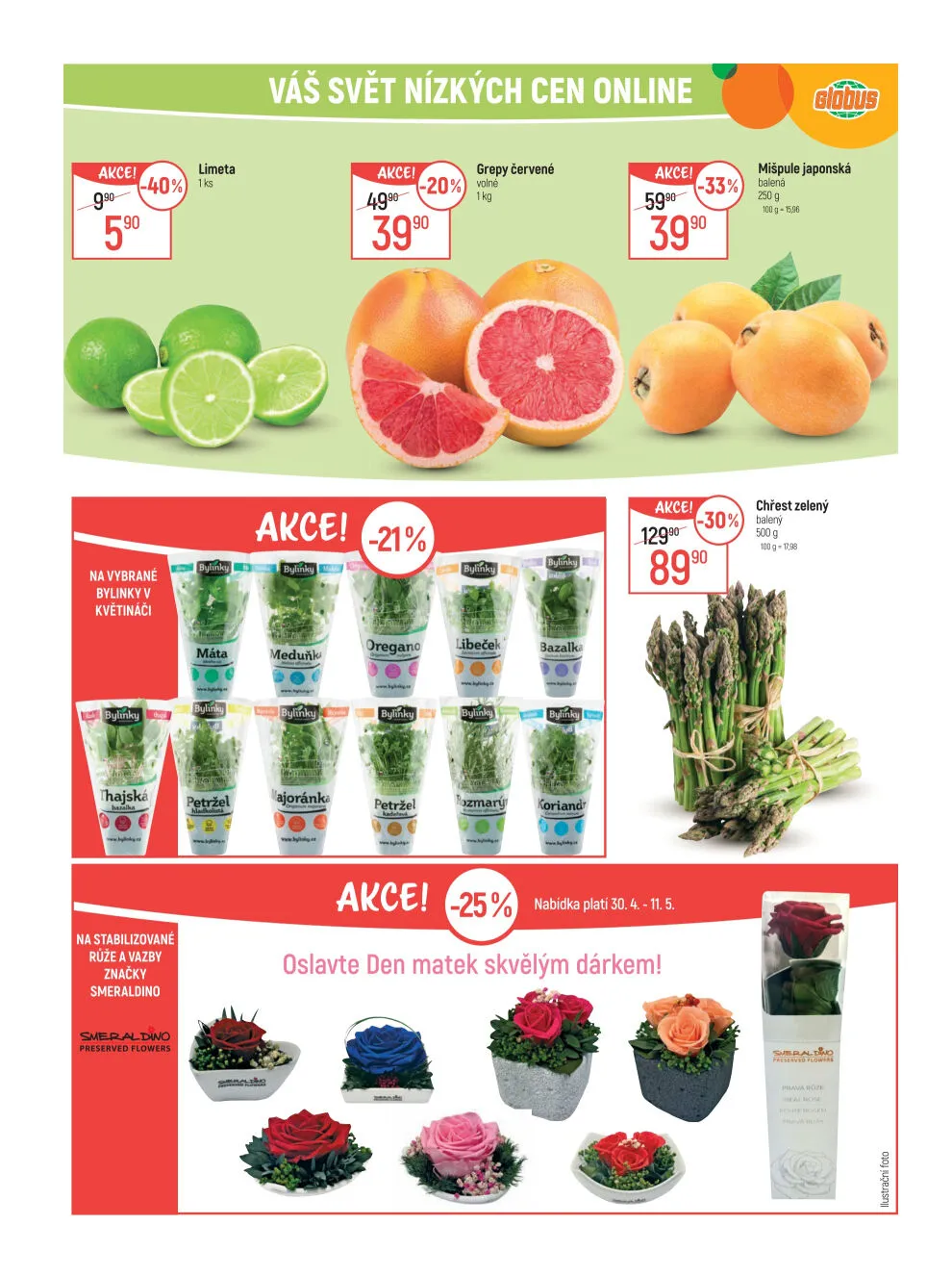 V letáku obchodu Globus najdete skvělé akce na vybrané bylinky v květináči, jako je bazalka a petržel, obě za cenu 39,90 Kč. Nezapomeňte také na červené grepy a chřest zelený, které jsou nyní v akci. Oslavte Den matek s jedinečnými dárky, jako jsou stabilizované růže a vazby značky Smeraldino. Nabídka platí od 30.4. do 11.5. Využijte svět nízkých cen online a udělejte radost sobě i svým blízkým!