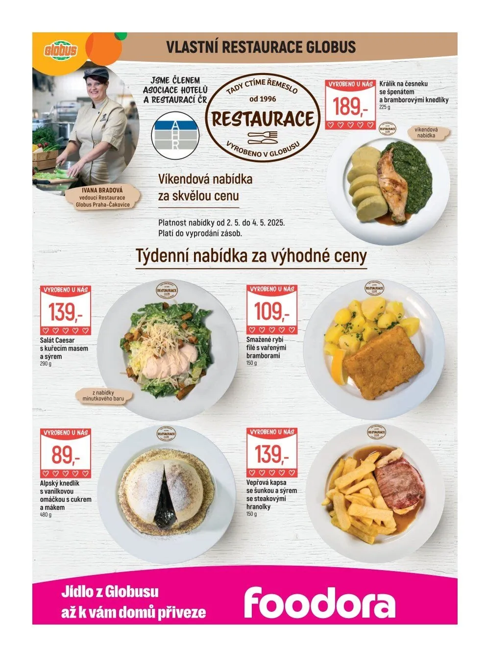 V letáku obchodu Globus najdete skvělou nabídku jídel z vlastní restaurace. Mezi lákavými pokrmy se objevuje králík na česneku se špenátem a bramborovými knedlíky za 189 Kč. Dále si můžete pochutnat na salátu Caesar s kuřecím masem a sýrem za 139 Kč. Pro milovníky sladkých dezertů je připraven alpský knedlík s vanilkovou omáčkou, cukrem a mákem za 89 Kč.