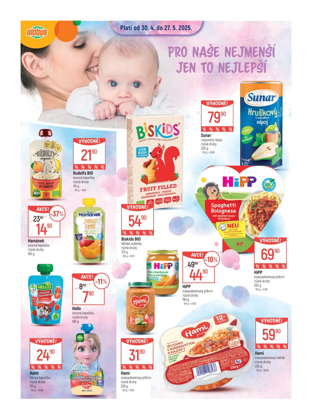 V letáku obchodu Globus najdete širokou nabídku kvalitních produktů pro děti a rodiny. Od 30. dubna do 27. května 2025 si můžete vybrat z různých druhů kapsiček Sunar, které jsou ideální pro malé strávníky. Nabízíme také bio kapsičky od značky Rudolf, které jsou chutné a zdravé.