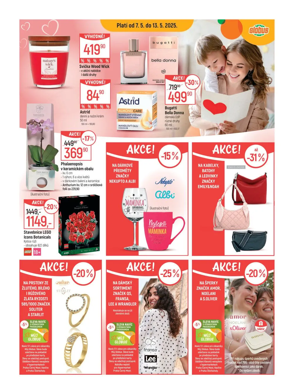 V letáku obchodu Globus, platném od 5. do 13. května 2025, najdete širokou nabídku produktů za akční ceny. Mezi nimi se objevuje stavebnice LEGO Icons Botanicals s 822 dílky za 1149 Kč. Dále si můžete pořídit svíčku Wood Wick za 419,90 Kč a denní krém Astrid za 369,90 Kč.