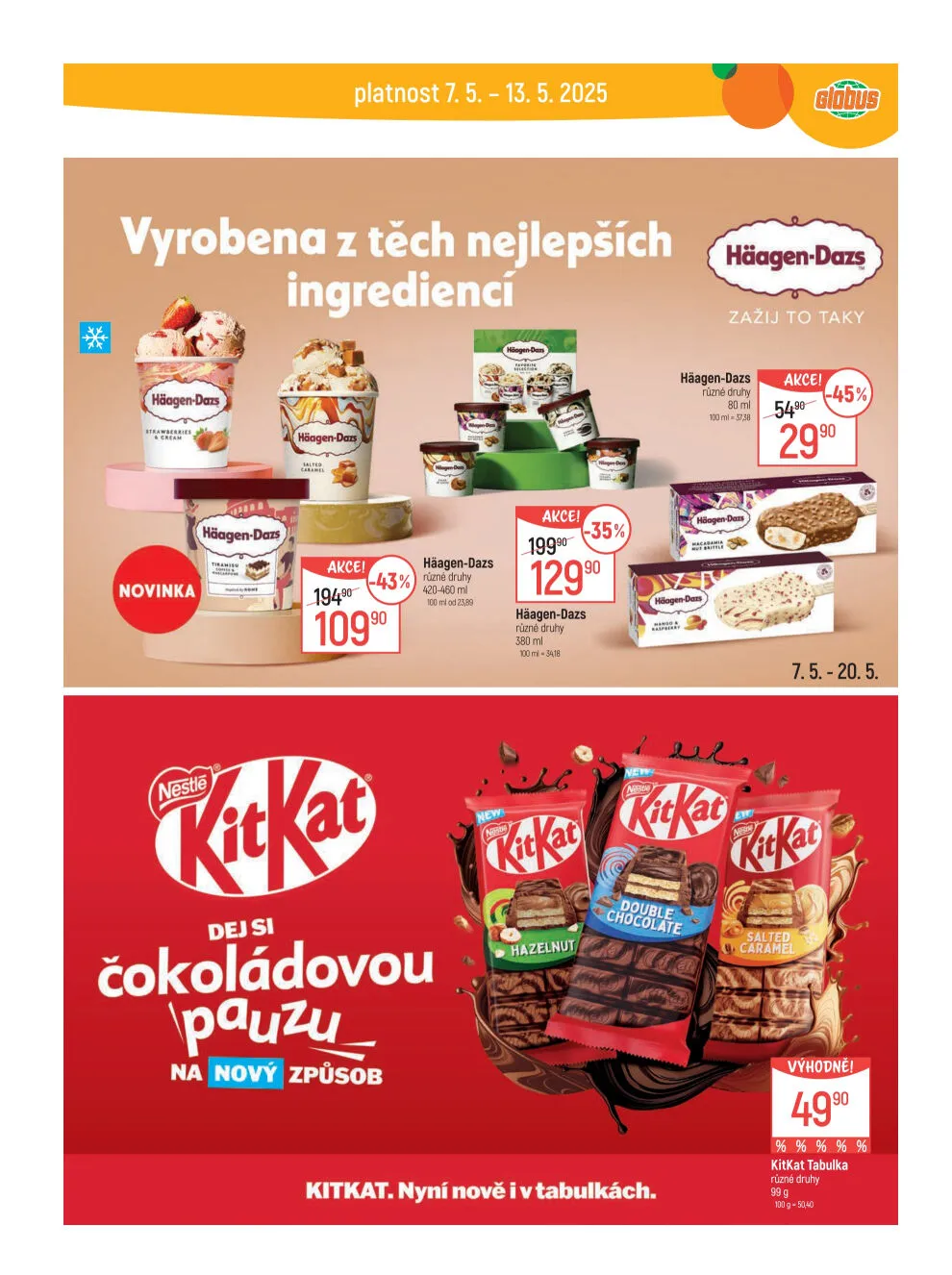 V letáku obchodu Globus na období od 7.5. do 13.5.2025 najdete skvělé nabídky na produkty vyrobené z těch nejlepších ingrediencí. Mezi novinkami se objevuje zmrzlina Häagen-Dazs v různých druzích, nyní za akční cenu 2990 Kč. Nezapomeňte také na čokoládovou pauzu s KitKat, který je nyní k dostání i v tabulkách za 90 Kč. Zažijte to nejlepší s našimi produkty!