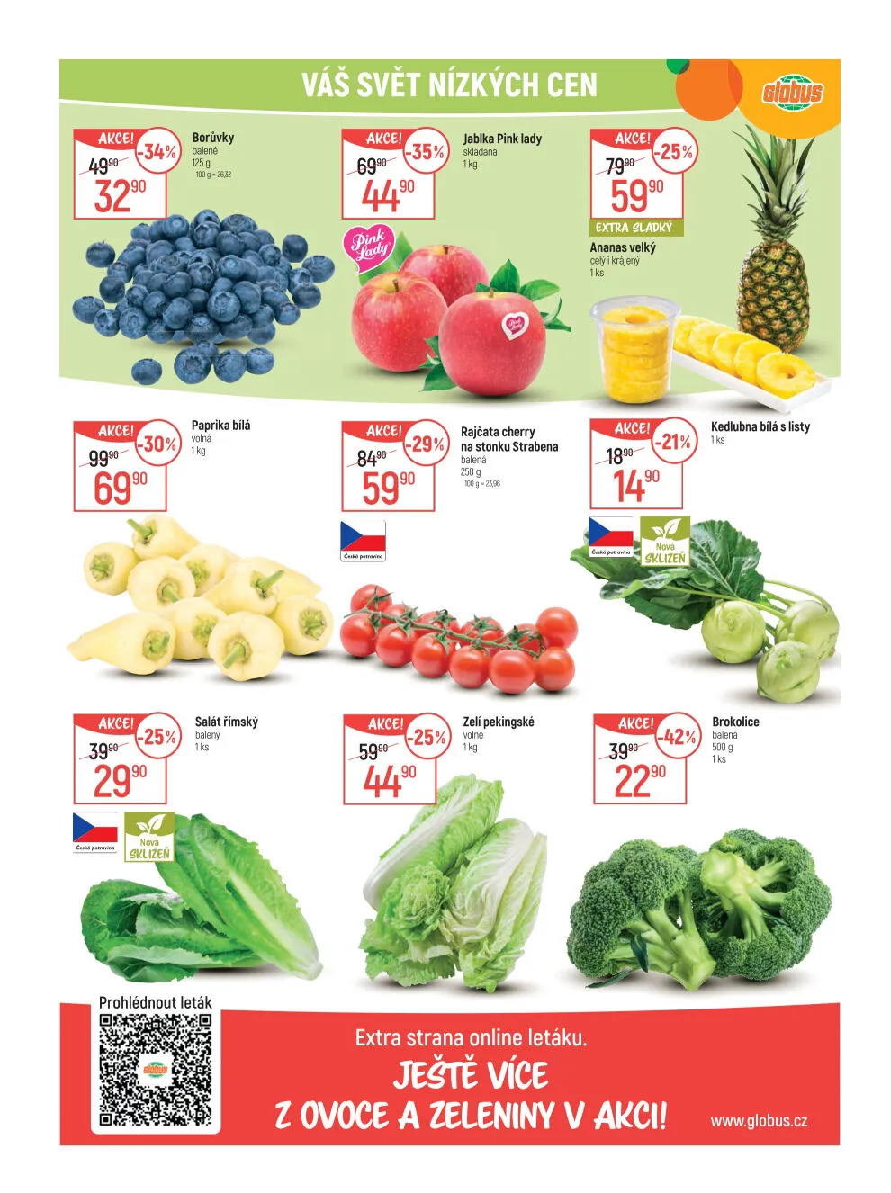 V obchodě Globus najdete širokou nabídku produktů za nízké ceny! Aktuální akce zahrnují borůvky balené 125 g za 2990 Kč, bílou papriku volnou 1 kg a římský salát. Nezapomeňte na jablka Pink Lady skládaná 1 kg a rajčata cherry na stonku balená 250 g. Také si můžete vychutnat pekingské zelí volné a velký ananas krájený za skvělou cenu. Mezi dalšími nabídkami najdete bílou kedlubnu s listy a brokolici 500 g. Prohlédněte si leták a objevte ještě více skvělých produktů!