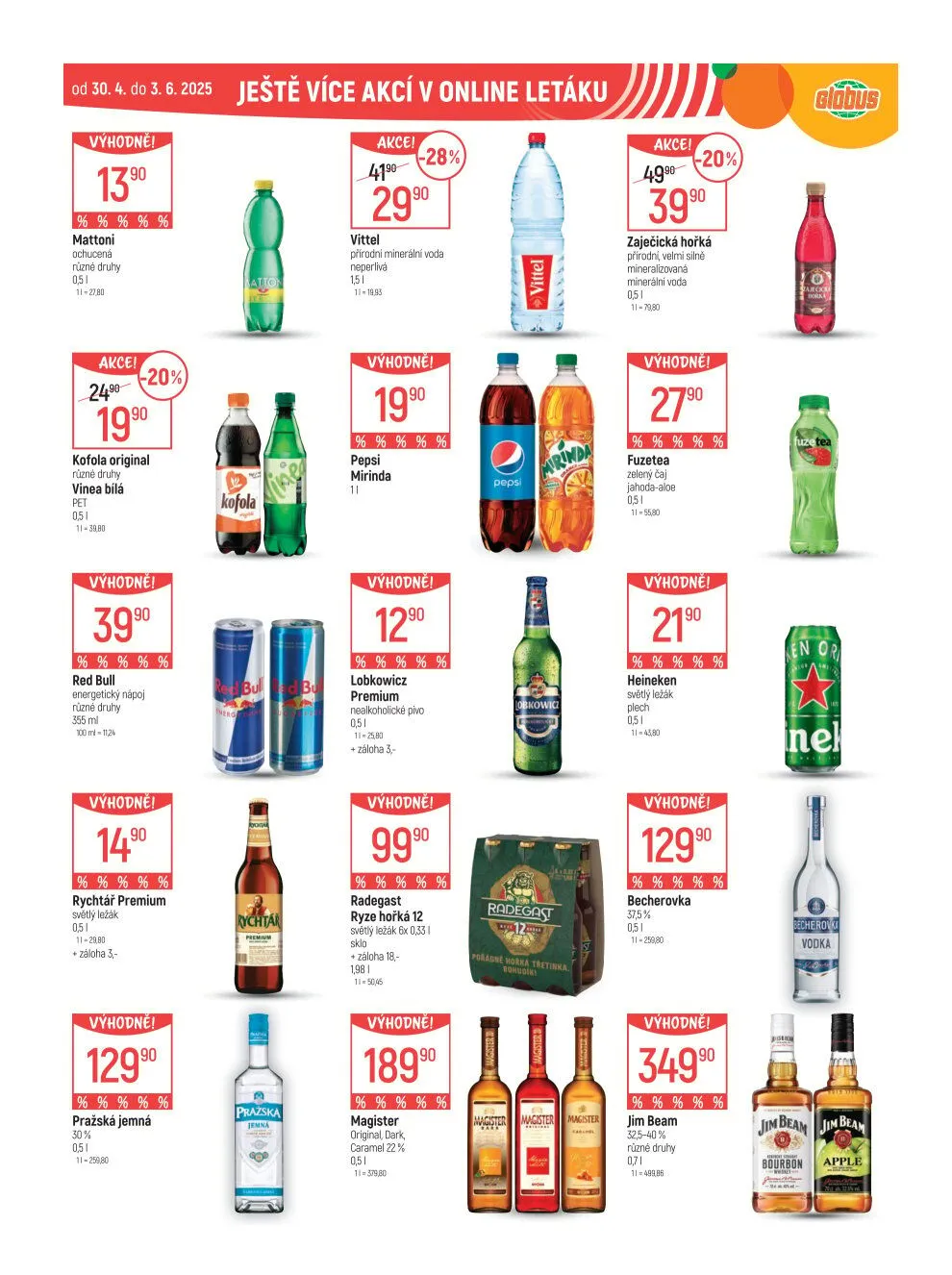 V letáku obchodu Globus najdete širokou nabídku výhodných produktů! Od 30.4. do 3.6.2025 si můžete vychutnat Mattoni ochlazenou v různých druzích za skvělou cenu 90 Kč. Nezapomeňte také na Kofolu Original a Vinea bílou, které jsou v akci.