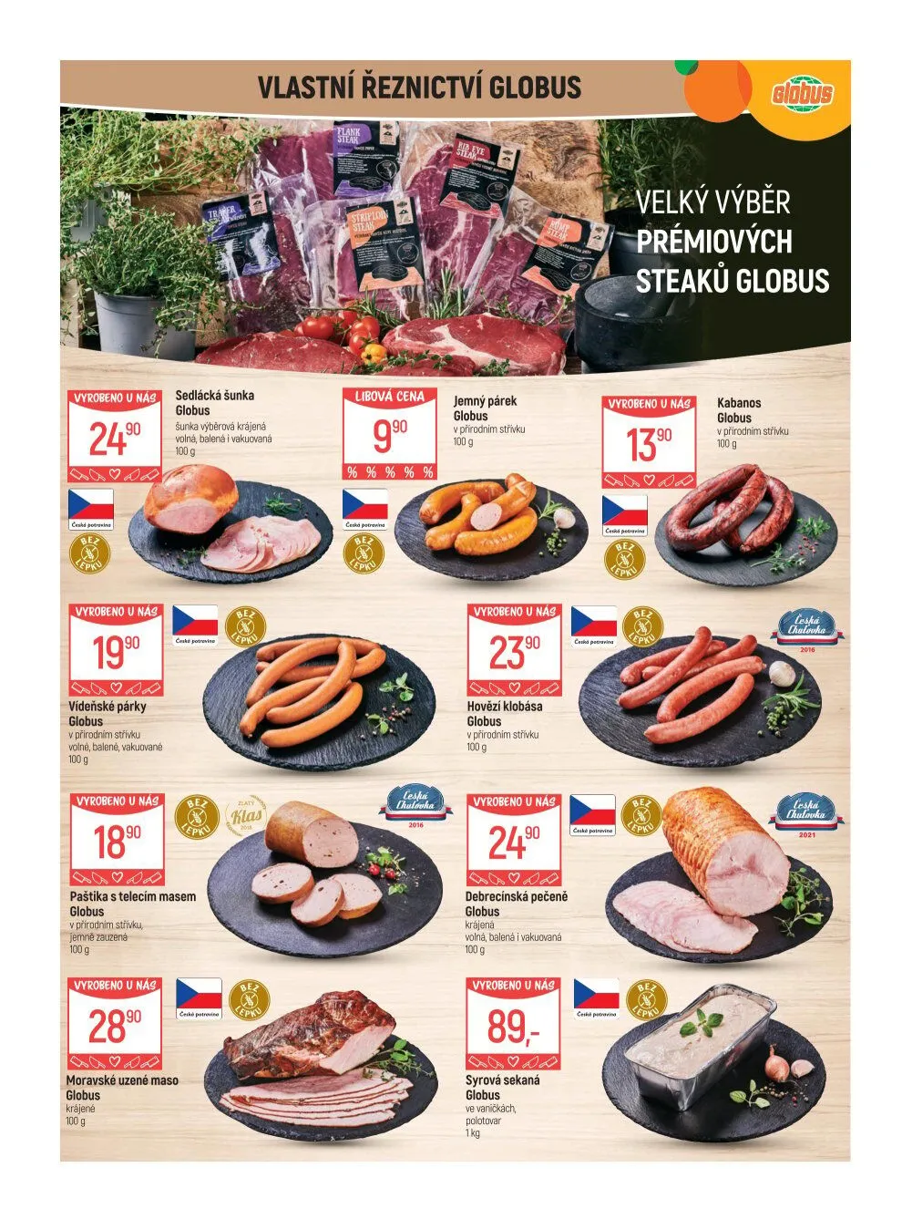 V letáku obchodu Globus najdete široký výběr kvalitních masných výrobků z vlastního řeznictví. Nabízíme prémiové steakové maso, které je vyrobeno u nás. Dále si můžete vychutnat hovězí párky a sedláckou šunku, obě balené vakuovaně pro maximální čerstvost.