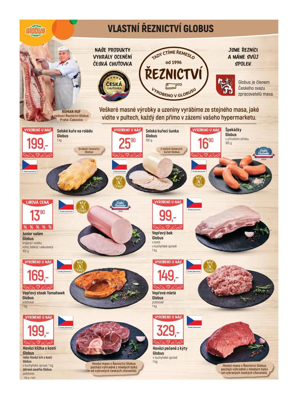 V našem řeznictví Globus ctíme tradiční řemeslo a nabízíme široký výběr kvalitních masných výrobků a uzenin. Od roku 1996 vyrábíme všechny produkty přímo v zázemí našich hypermarketů, což zaručuje čerstvost a kvalitu. Naše výrobky, jako je selské kuře na roládu, vepřový bok, hovězí pečené z kýty nebo játrová zavářka, pocházejí výhradně z mladých býků od vybraných českých chovatelů.