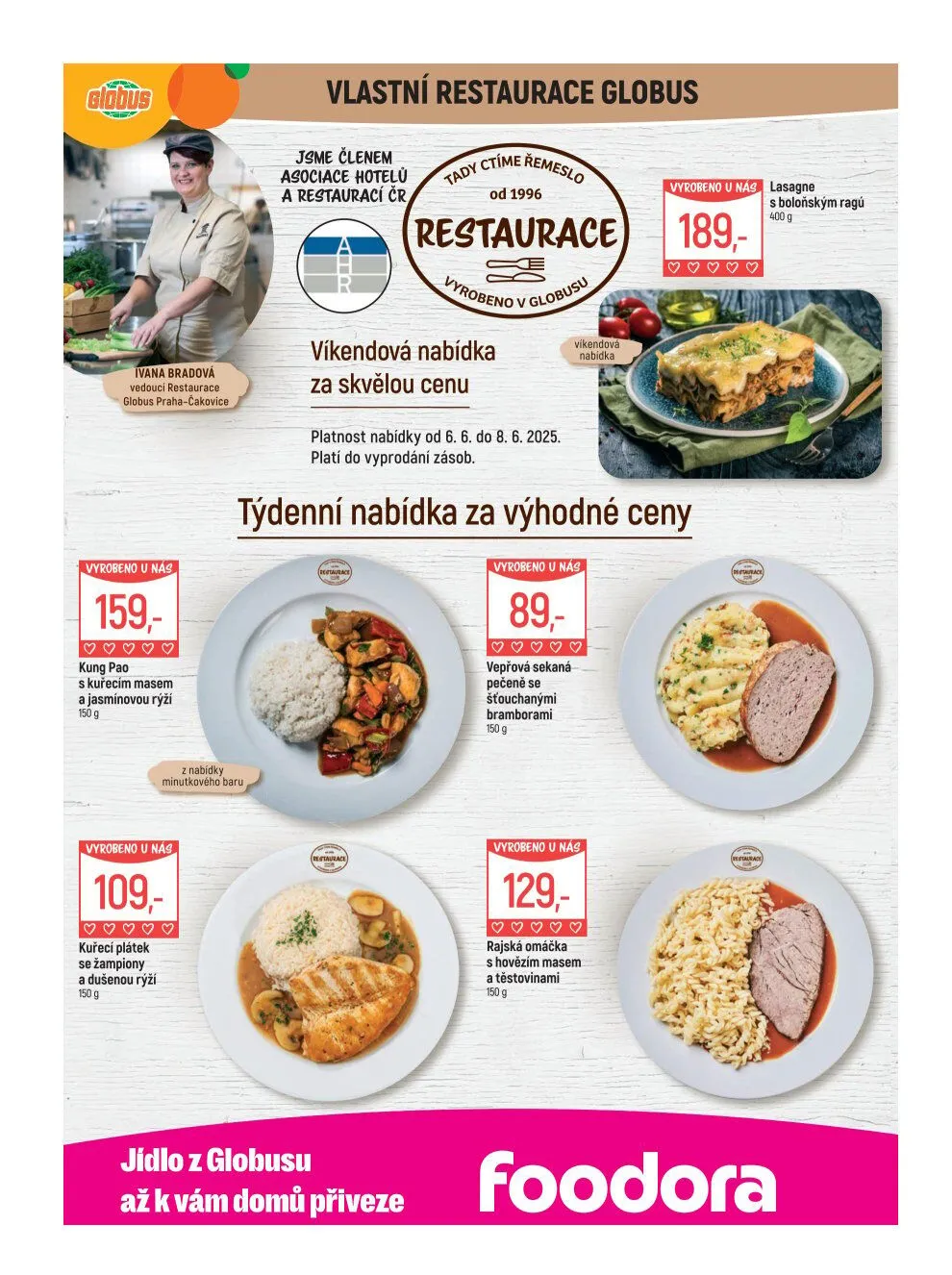 V letáku obchodu Globus najdete skvělou víkendovou nabídku od 6.6. do 8.6.2025. Mezi lákavými pokrmy se objevují lasagne s boloňským ragú za 189 Kč a kung pao s kuřecím masem a jasmínovou rýží za 159 Kč. Pro milovníky rychlého občerstvení je připravený kuteci plátek se žampiony a dušenou rýží za 109 Kč. Nezapomeňte také na vepřovou sekanou pečenou se šťouchanými bramborami za 89 Kč a rajskou omáčku s hovězím masem a těstovinami za 129 Kč. Všechny pokrmy jsou vyrobeny u Nág a jsou k dispozici do vyprodání zásob. Jídlo z Globusu vám přiveze až domů služba Foodora.