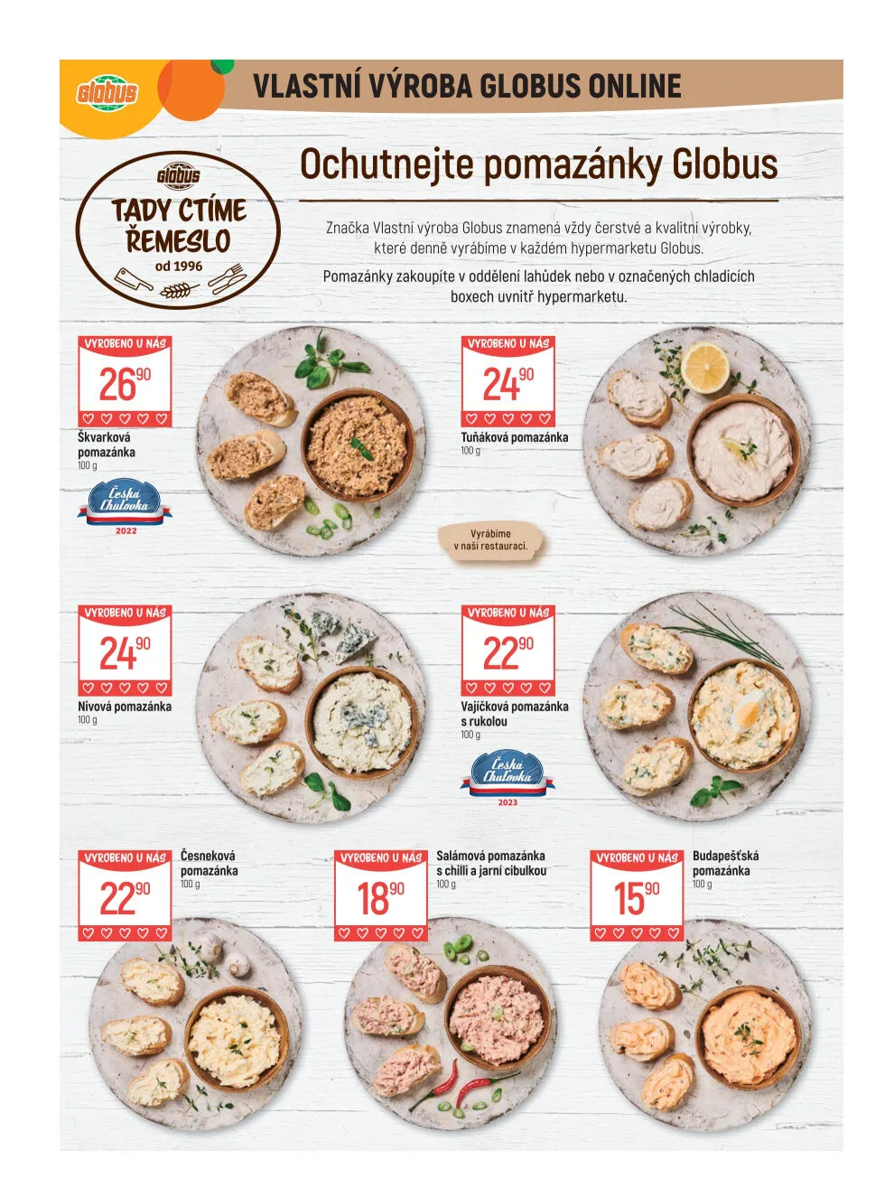 V letáku obchodu Globus najdete širokou nabídku lahodných pomazánek, které jsou vyráběny přímo v hypermarketech. Mezi oblíbené produkty patří škvarková pomazánka, česneková nivová pomazánka, tuňáková pomazánka a vajičková pomazánka s rukolou. Každá z těchto pomazánek je vyrobena z čerstvých a kvalitních surovin, což zaručuje jejich vynikající chuť. Pomazánky si můžete zakoupit v oddělení lahůdek nebo v označených chladicích boxech. Ochutnejte naše vlastní výrobky a objevte nové chutě!