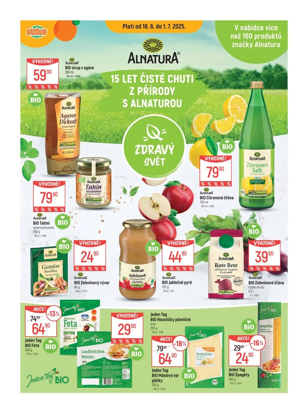 V letáku obchodu Globus najdete širokou nabídku více než 160 produktů značky Alnatura. Mezi nimi se nachází bio sirup z agáve (280 ml) za cenu 59,90 Kč, bio tahini, bio zeleninový vývar a bio citronová šťáva (750 ml) za 39,90 Kč. Dále si můžete vybrat z bio jablečného pyré a bio houstiček pšeničných. Akce platí od 18.6. do 1.7.2025. Objevte čistou chuť přírody s Alnaturou!