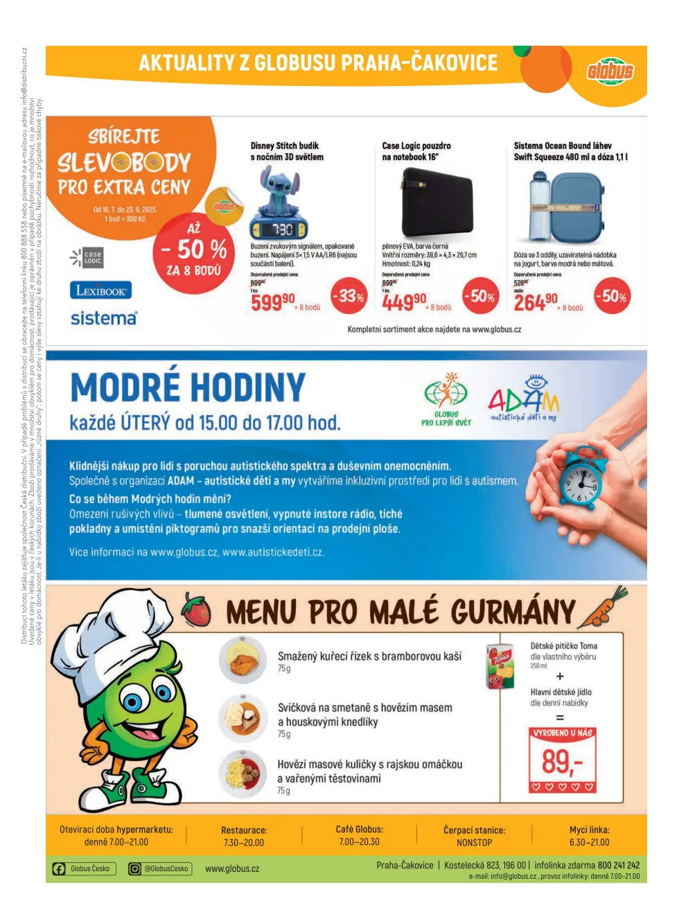 V letáku obchodu Globus Praha-Čakovice najdete širokou nabídku produktů za extra ceny, s možností ušetřit až 50%. Mezi zajímavé položky patří například noční světlo Disney Stitch od značky Lexibook, pouzdro na notebook Case Logic a láhev Sistema Ocean Bound.