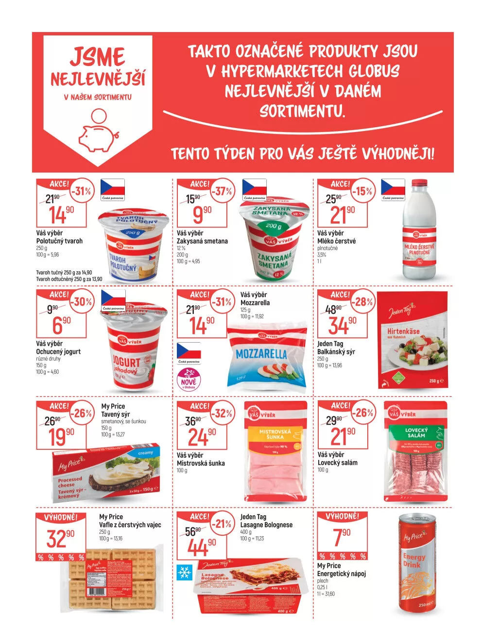 jgme nejlevnějží v nažem gortimentu akce! -31% váš výběr polotučný tvaroh 250 g tvaroh tučný 250 g za tvaroh odtučnéný 250 g za takto označené produkty jgou v hypermarketech globug nejlevnějži' v daném gortlmentu. tento týden pro vág ježtě výhodněji! arce! váš výběr zakysaná smetana zoo g kysaná metan4 akce! váš výběr ochucený jogurt r úzré 150 g akce! 2ffo?- 90 vyhovne! 3290 akce' váš výběr mozzarella 90 my price tavený sýr smetanový, se šunkou 150 g my price vafle z čerstvých vajec nově akce' -36w 2490 váš výběr mistrovská šunka akce' 90 mozzarella jeden tag lasagne bolognese arce! 90 , váš výběr mléko čerstvé plnotučné arce' 3490 jeden tag balkánský sýr : 25dg arce' 90 váš výběr lovecký salám vyhodne' , my price : energetický nápoj : plech 0251 plnotučné hirtenkáse uvaér lovecký salám energy drink
