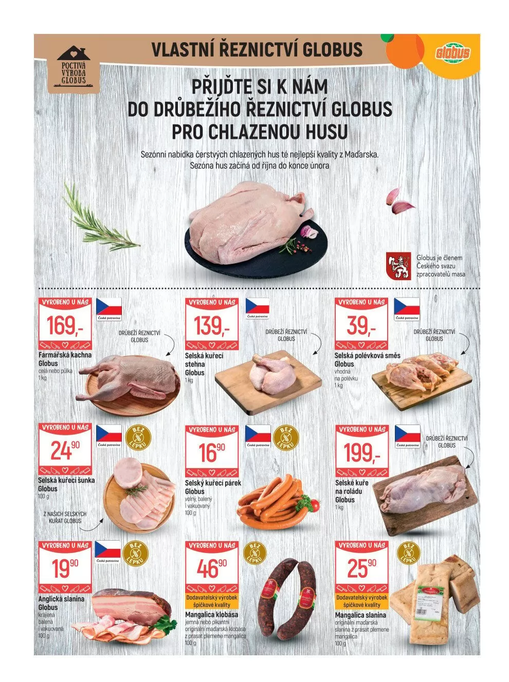 V letáku obchodu Globus najdete širokou nabídku kvalitních produktů vyrobených u nás. Mezi nimi se nachází farmářská kachna za 169,- Kč, selské kuřecí stehno za 139,- Kč a selské kuřecí párky za 90,- Kč. Nezapomeňte také na sezónní nabídku čerstvých hus, která je k dispozici od října do února.