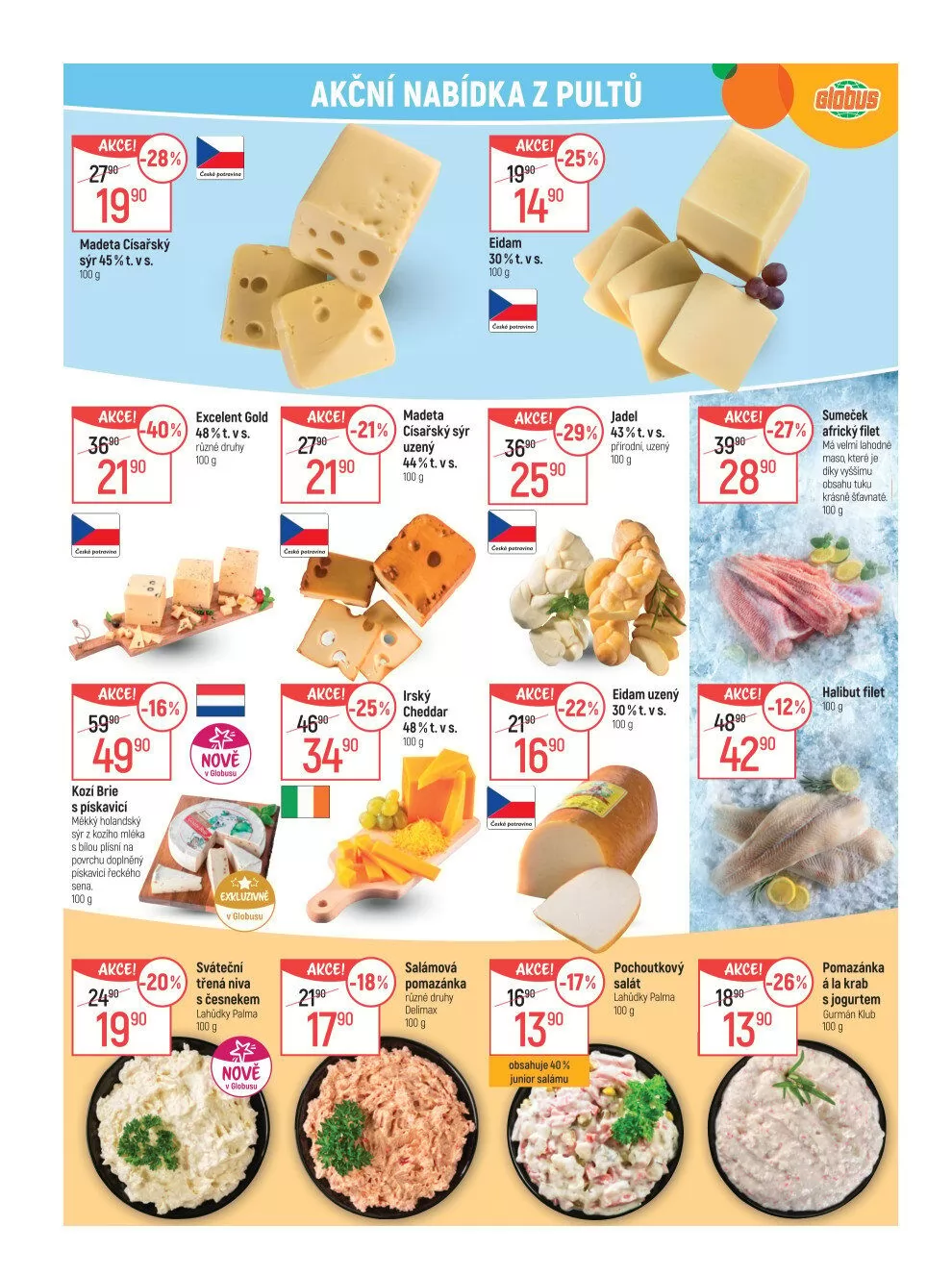 V letáku obchodu Globus najdete skvělé akční nabídky na široký výběr sýrů a lahůdek.