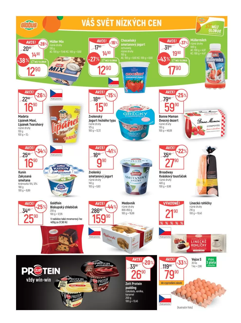 Mezi akčními položkami se objevují Müller mix a různé druhy jogurtů, jako je Lipánek maxi a tvarohový. Nezapomeňte také na zakysanou smetanu Kunín a biskupský chlebiček Goldfein, který je nyní se slevou 25%.