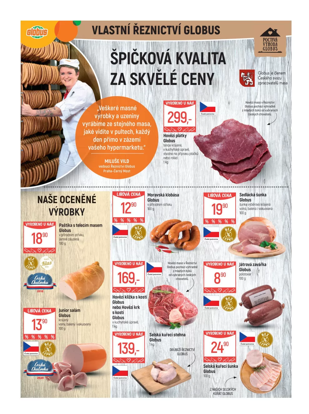 V letáku obchodu Globus najdete širokou nabídku kvalitních masných výrobků z vlastního řeznictví. Naše spičková řeznictví vyrábí veškeré masné výrobky a uzeniny přímo v zázemí hypermarketu, což zaručuje čerstvost a kvalitu.