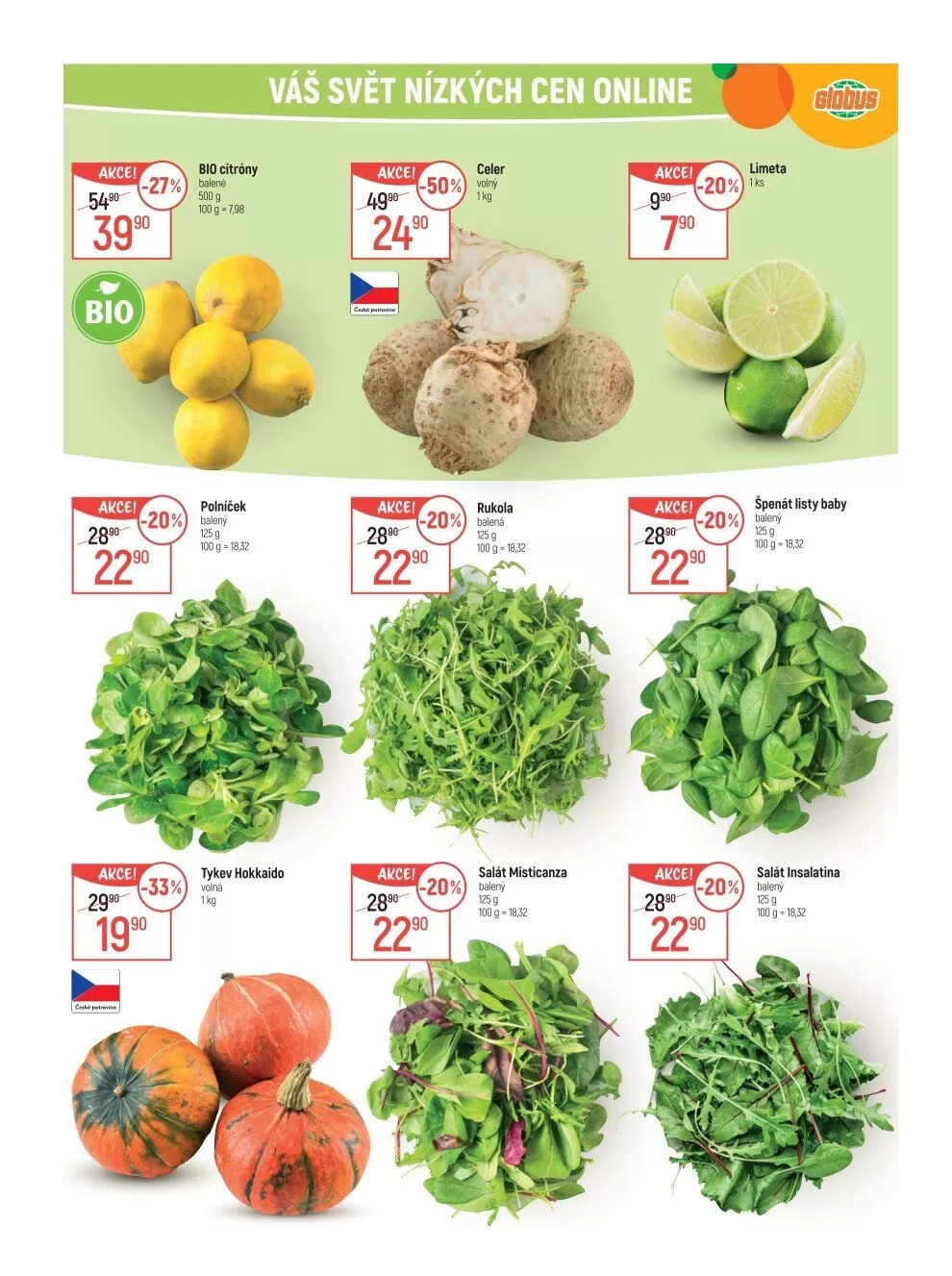 Bio citróny za 22,90 Kč, celer a rukolu v akci, tykev hokkaido za 39,90 Kč za kilogram.