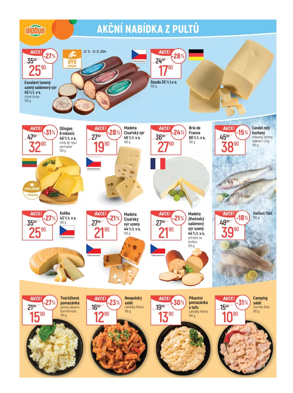 V letáku obchodu Globus najdete skvělé akční nabídky z pultů. Mezi nimi excelentní tavený uzený salámový sýr s 45% t.v.s. za akční cenu 32,90 Kč za 100 g, nyní se slevou -31%. Dále nabízíme tvrdý sýr typu parmazán s 40% t.v.s. za 90 Kč za 100 g.