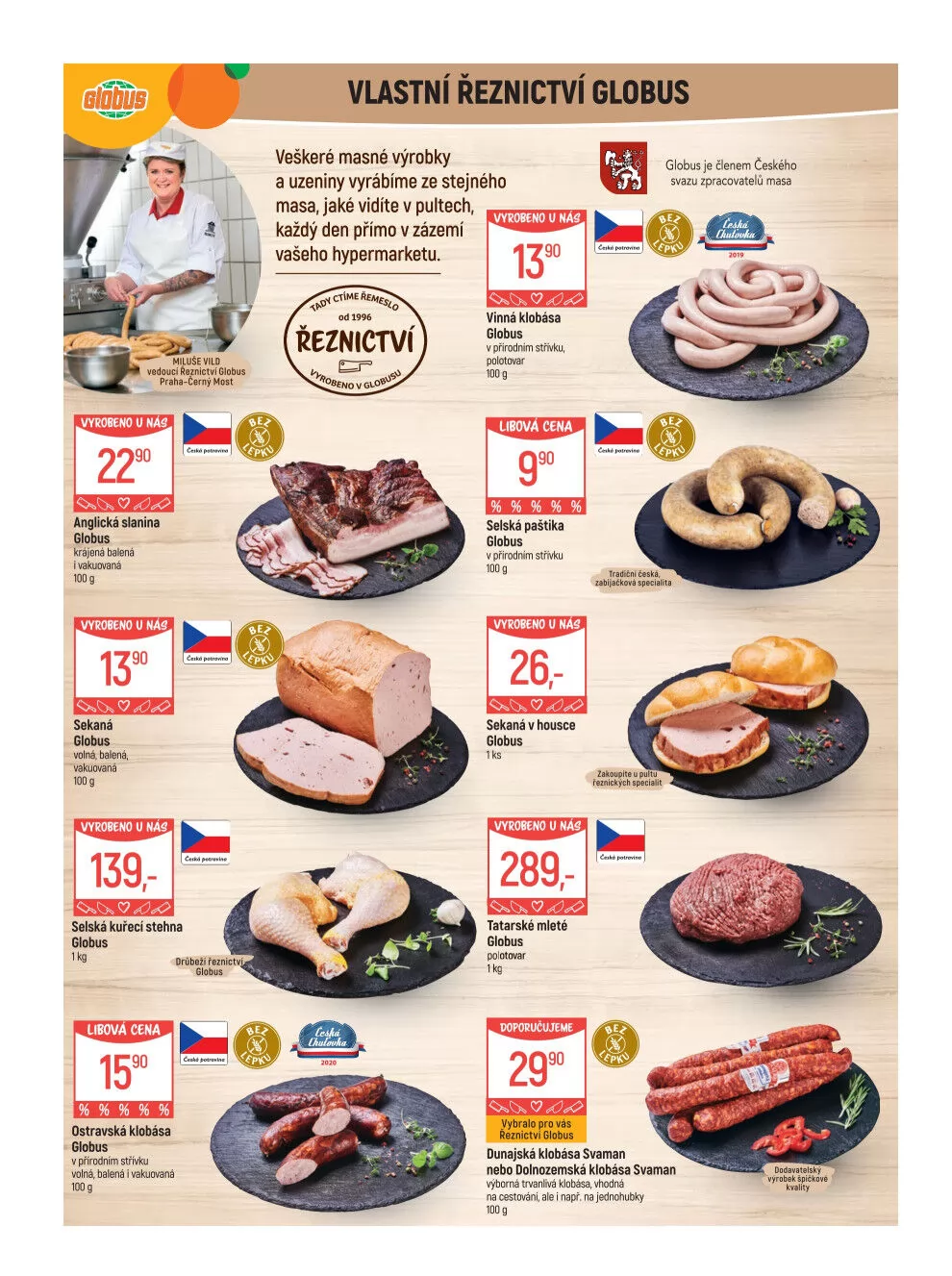V letáku obchodu Globus najdete širokou nabídku masných výrobků a uzenin, které jsou vyráběny přímo v zázemí hypermarketu. Všechny produkty jsou vyrobeny z kvalitního masa, které můžete vidět na pultech.