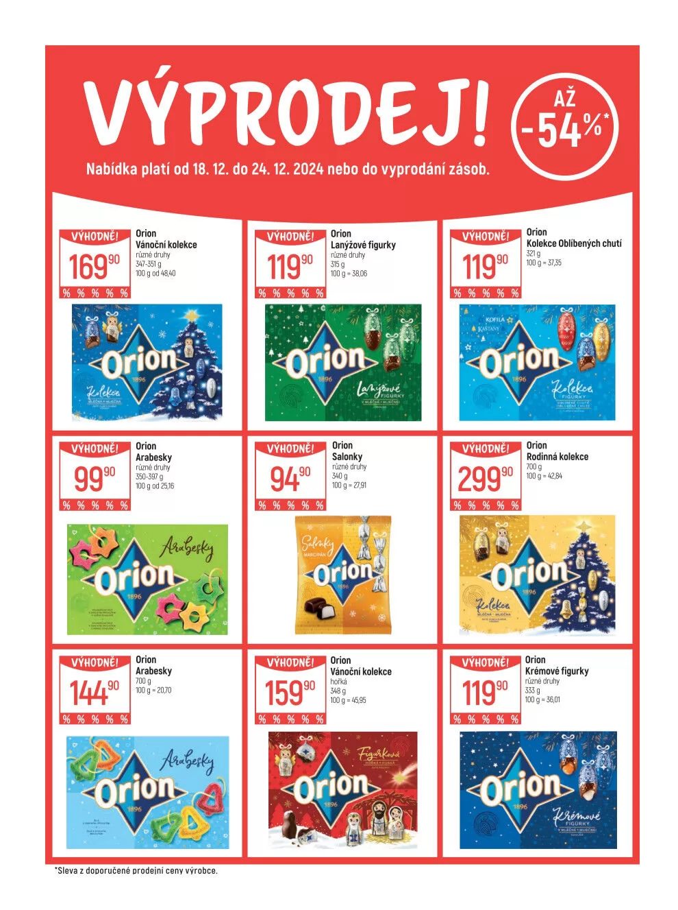 V letáku obchodu Globus najdete širokou nabídku vánoční kolekce od značky Orion. Mezi produkty se objevují různé druhy lanýžových figurek a salonků, které potěší každého milovníka sladkostí. Nabízíme také rodinnou kolekci oblíbených chutí o hmotnosti 700 g. Nezapomeňte využít výhodné ceny, které začínají již na 90 Kč. Přijďte si vybrat z naší pestré nabídky a užijte si sváteční atmosféru!