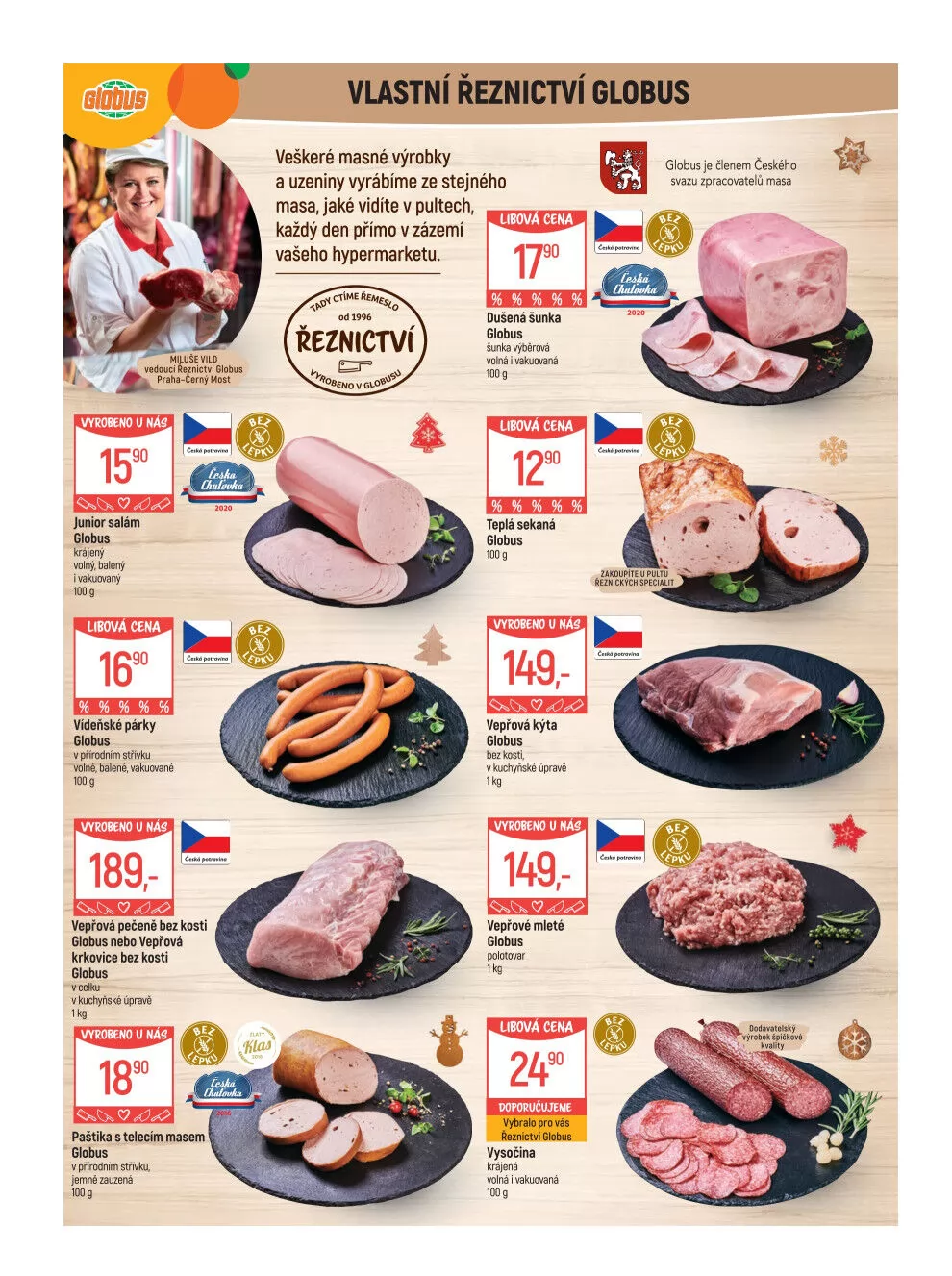 V letáku obchodu Globus najdete širokou nabídku kvalitních masných výrobků a uzenin, které jsou vyráběny přímo v řeznictví Globus. Mezi nabízené produkty patří: