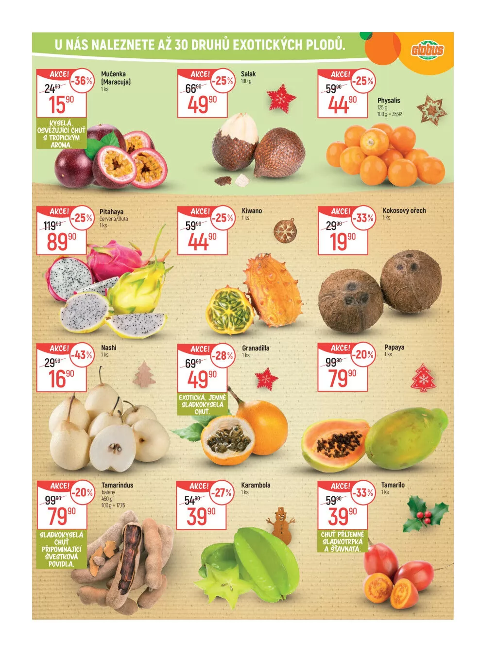 V letáku obchodu Globus najdete širokou nabídku exotických plodů, které potěší vaše chuťové pohárky. Nabízíme až 30 druhů, včetně mučenky (maracuja) a tamarindu, nyní se slevou 20%. Dále si můžete vychutnat jemnou karambolu, která je k dostání za akční cenu 39,90 Kč za kus. Nezapomeňte také na chutný physalis a tamarilo, které jsou ideální pro osvěžení. Přijďte si vybrat a objevte nové chutě!