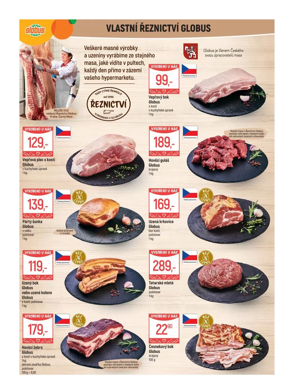 V letáku obchodu Globus najdete širokou nabídku masných výrobků a uzenin, které jsou vyráběny přímo v zázemí hypermarketu. Každý den se zde zpracovává kvalitní maso, které můžete vidět na pultech.