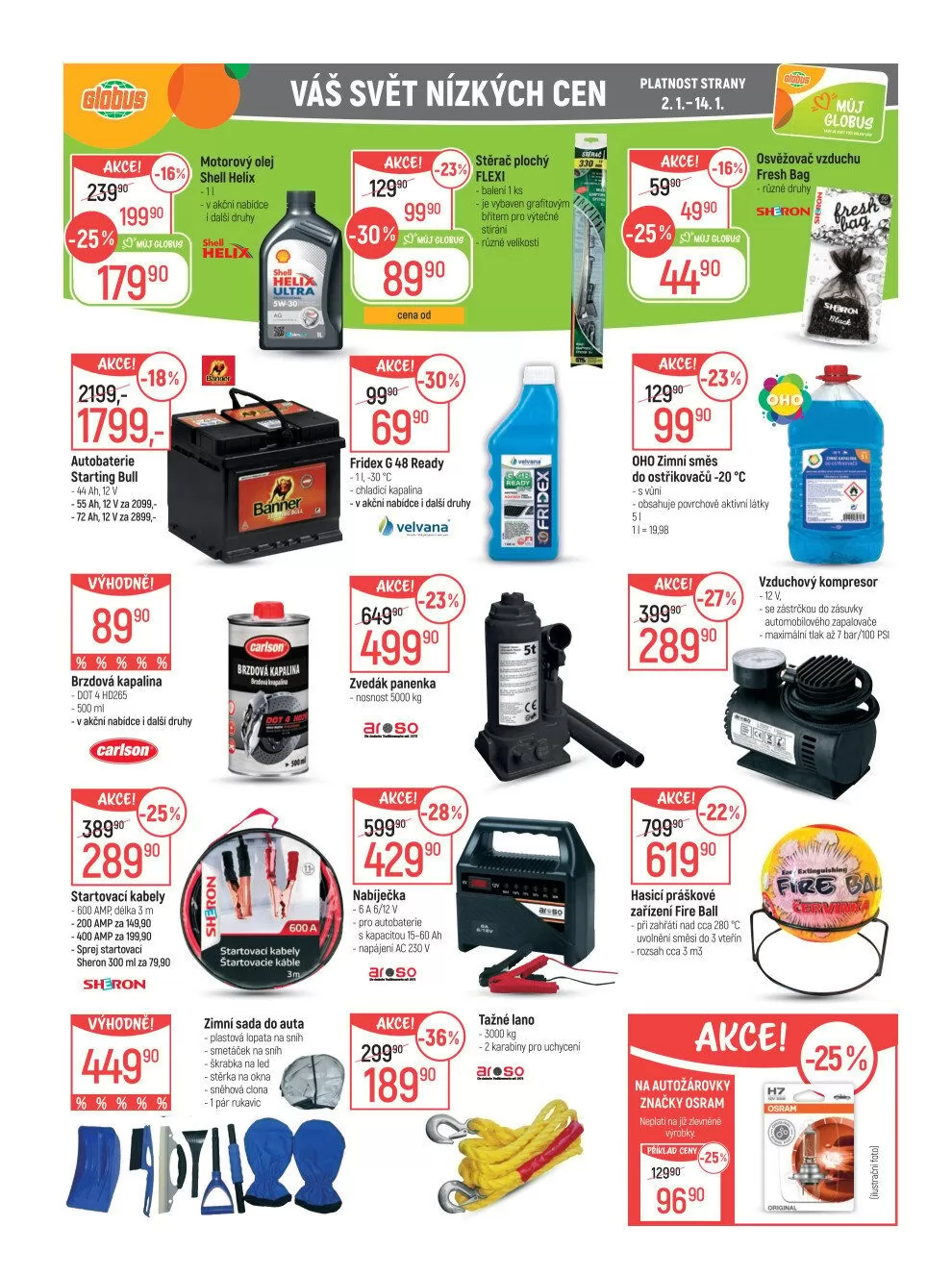 V letáku obchodu Globus najdete širokou nabídku produktů za nízké ceny, platnou od 2.1. do 14.1. Mezi zajímavé akční nabídky patří autobaterie Starting Bull za 1 799 Kč a brzdová kapalina Carlson. Dále si můžete pořídit startovací kabely s kapacitou 200 ampér za 2 899 Kč nebo motorový olej Shell Helix.