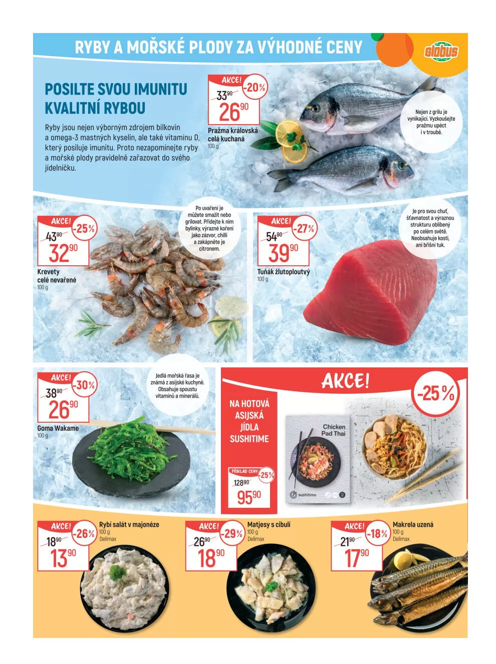 V letáku obchodu Globus najdete širokou nabídku ryb a mořských plodů za výhodné ceny. Posilte svou imunitu kvalitní rybou, která je skvělým zdrojem bílkovin a omega-3 mastných kyselin, stejně jako vitaminu D. Nezapomínejte pravidelně zařazovat ryby a mořské plody do svého jídelníčku.