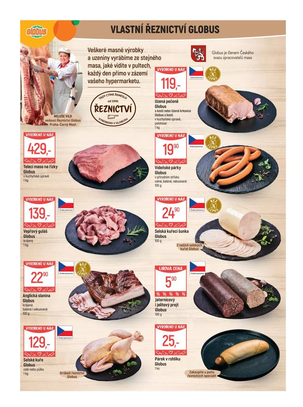 V letáku obchodu Globus najdete širokou nabídku masných výrobků a uzenin, které jsou vyráběny přímo v jejich řeznictví. Všechny produkty pocházejí z kvalitního masa, které je k dispozici v pultech. Mezi nabízenými produkty se můžete těšit na telecí maso na řízky za 429 Kč/kg, vepřový guláš za 139 Kč/kg, anglickou slaninu za 229 Kč/kg a selské kuře za 119 Kč/kg. Dále si můžete vychutnat uzenou pečeně nebo krkovici, vídeňské párky a selskou kuřecí šunku. Nezapomeňte také na lahodné jaternicové a jelitové prejt, které jsou k dostání za 25 Kč/100 g. Všechny tyto speciality si můžete zakoupit přímo u pultu řeznictví v hypermarketu Globus.