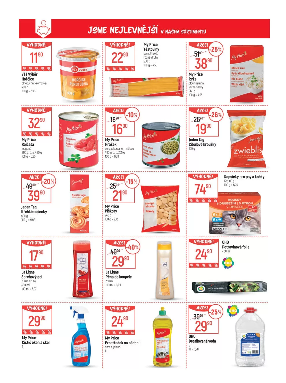 Mezi nimi se objevují plnotubná kremžská hořčice za 32,90 Kč a nucená rajčata za 39,90 Kč.