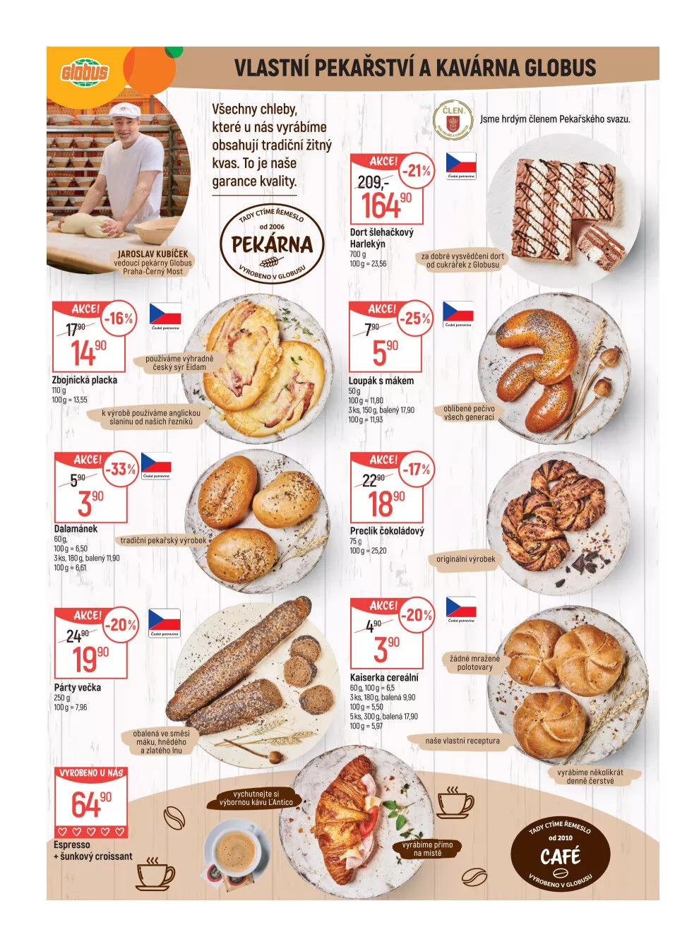 V letáku obchodu Globus najdete širokou nabídku čerstvého pečiva a lahodných dezertů. Naše pekárna v Praze-Terný se pyšní tradičními chleby, které obsahují žitný kvas, což je zárukou kvality. Mezi oblíbené produkty patří šlehačkový dort Harlekýn a zbojnická placka, které jsou nyní v akci.