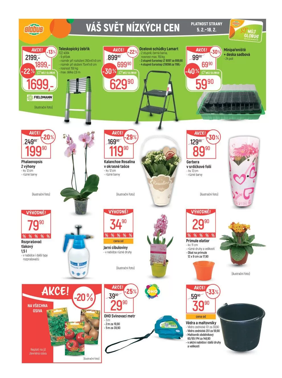 V letáku obchodu Globus najdete širokou nabídku produktů za výhodné ceny. Mezi akčními položkami se objevují například krásné orchideje phalaenopsis s dvěma výhony za 199,90 Kč v různých barvách. Pro milovníky rostlin je k dispozici kalanchoe rosalina v okrasné tašce za 119,90 Kč.