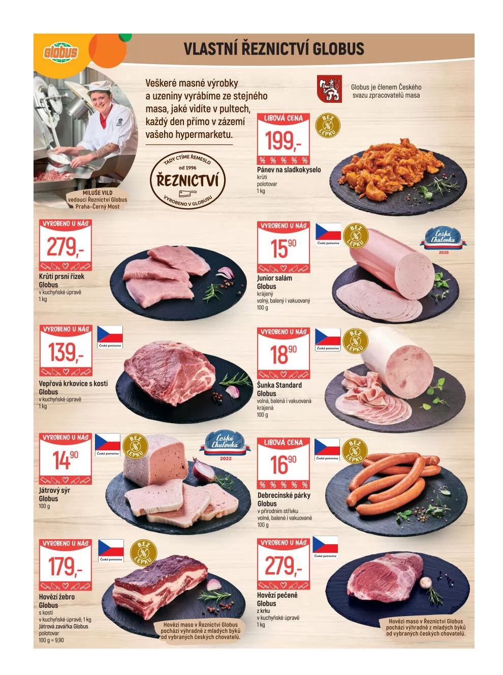 V letáku obchodu Globus najdete širokou nabídku masných výrobků a uzenin, které jsou vyráběny přímo v jejich řeznictví. Mezi nabízené produkty patří krůtí prsní řízek, vepřová krkovice s kostí, hovězí žebro a játrový sýr. Všechny produkty jsou připravovány z kvalitního masa, které pochází výhradně od vybraných českých chovatelů.
