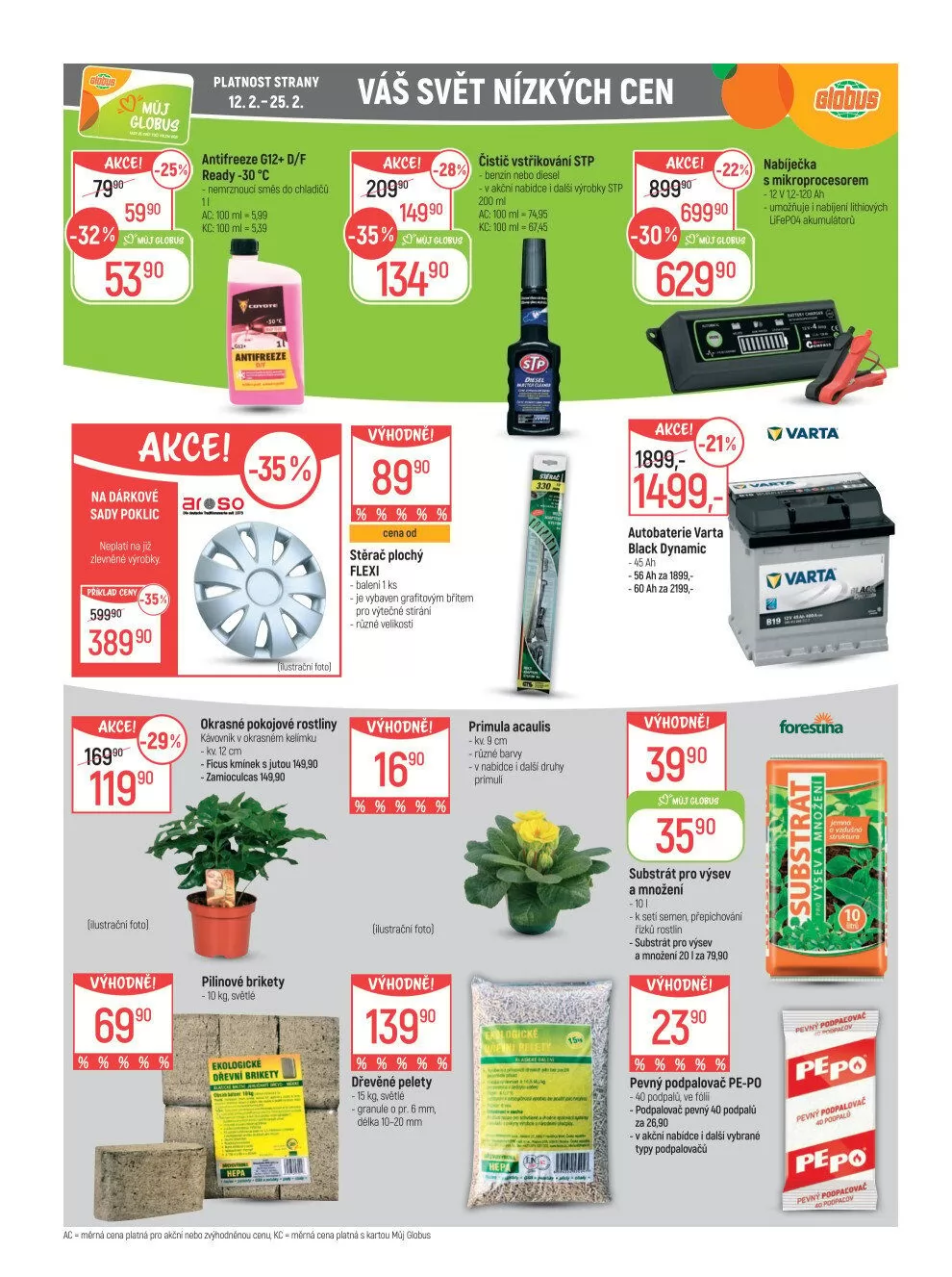 V obchodě Globus probíhá akce s nízkými cenami, která platí od 12.2. do 25.2. Mezi nabízenými produkty najdete nemrznoucí kapalinu do chladiče za 149,90 Kč a ploché stěrače Flexi v různých velikostech. Dále jsou v akci čističe vstřikování pro benzínové a dieselové motory.