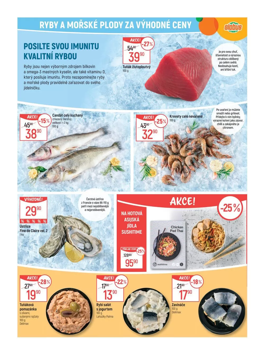 V letáku obchodu Globus najdete širokou nabídku ryb a mořských plodů za výhodné ceny. Posilte svou imunitu kvalitní rybou, která je skvělým zdrojem bílkovin a omega-3 mastných kyselin, a také vitaminu D. Nezapomínejte zařazovat ryby a mořské plody do svého jídelníčku.