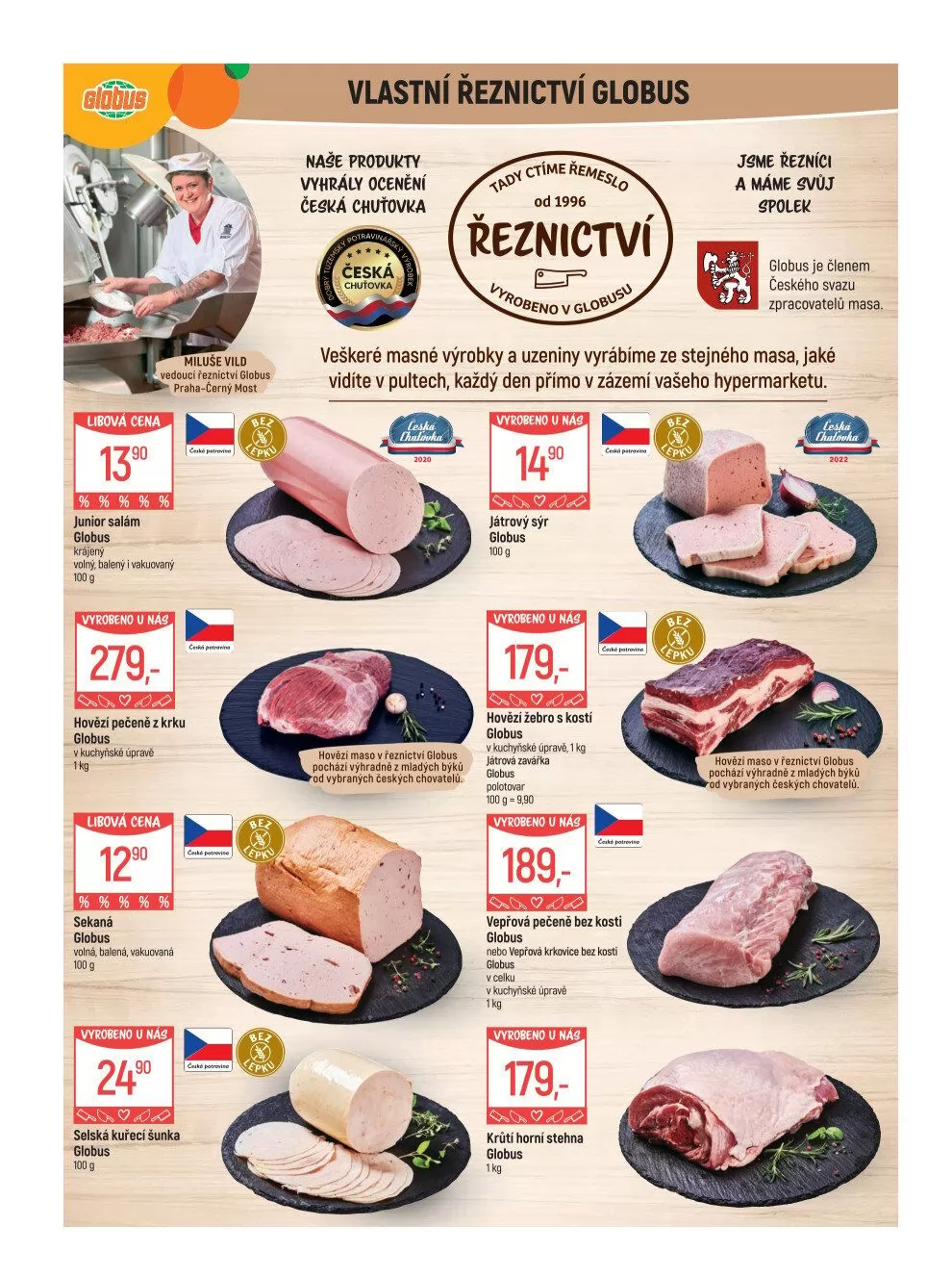 V našem řeznictví Globus ctíme tradiční řemeslo a od roku 1996 vyrábíme kvalitní masné výrobky, které získaly řadu ocenění. Naše produkty, jako je junior salám, hovězí pečené z krku, sekaná a játrový sýr, jsou vyráběny přímo v zázemí hypermarketu z masa od vybraných českých chovatelů.