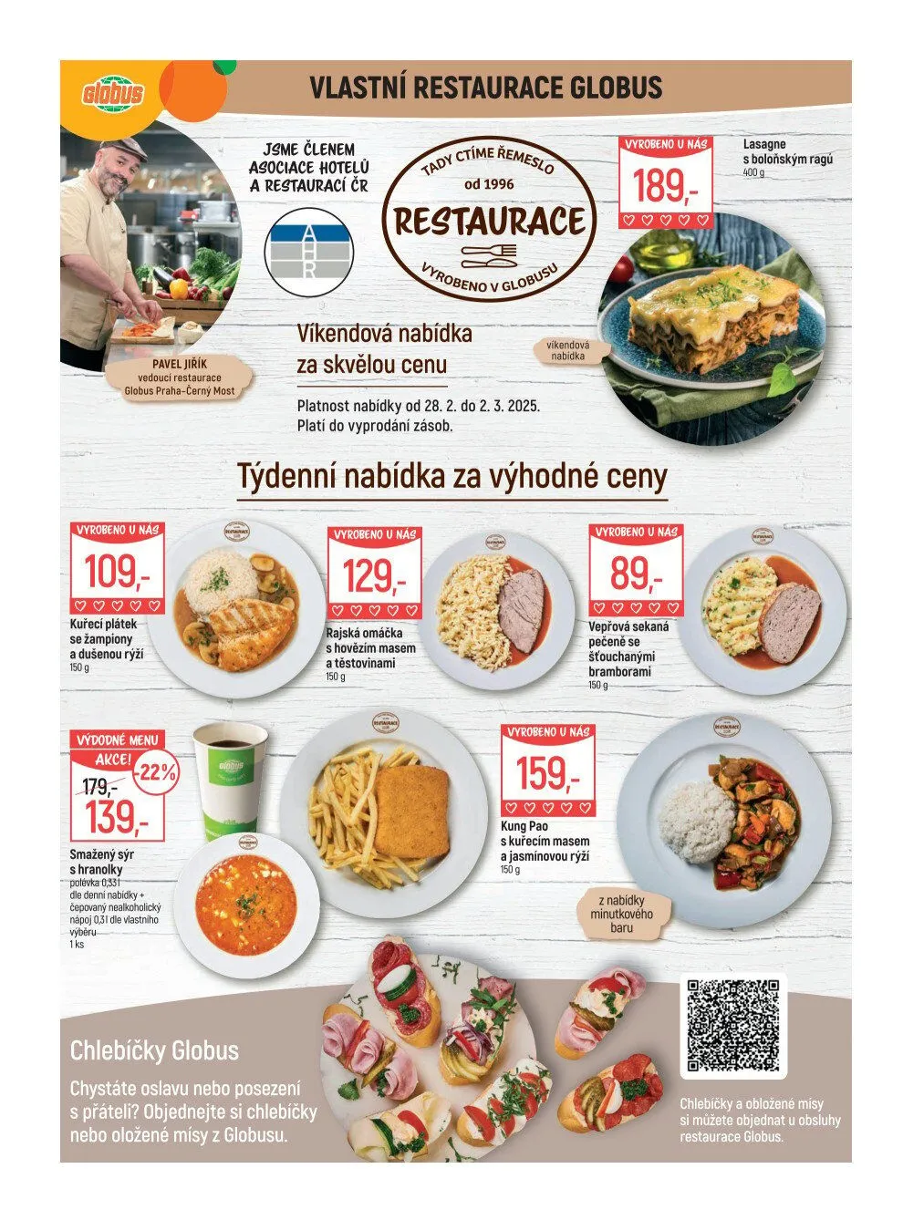 Pokud plánujete oslavu nebo posezení s přáteli, neváhejte si objednat chlebíčky nebo obložené mísy přímo u obsluhy restaurace Globus. Platnost nabídky je od 28.2. do 2.3.2025, platí do vyprodání zásob.