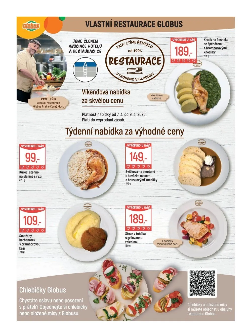 V letáku obchodu Globus najdete skvělou nabídku jídel z vlastní restaurace. Mezi lákavé pokrmy patří králík na česneku se špenátem a bramborovými knedlíky za 189 Kč, kuřecí stehno na slanině s rýží za 109 Kč a smažený karbanátek s kaší za 149 Kč. Nezapomeňte také na víkendovou nabídku, která platí od 7.3. do 9.3.2025, a to do vyprodání zásob.