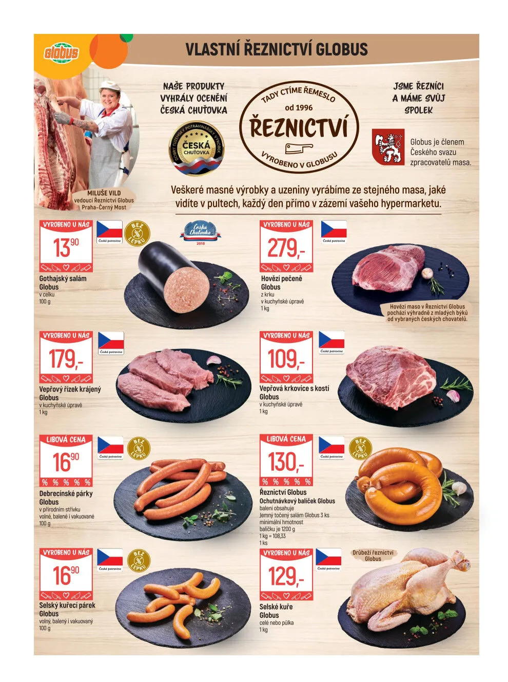V letáku obchodu Globus najdete širokou nabídku kvalitních masných výrobků z vlastního řeznictví. Naše produkty, které ctí tradiční řemeslo, získaly ocenění od roku 1996. Všechny masné výrobky a uzeniny vyrábíme ze stejného masa, jaké vidíte v pultech, přímo v zázemí vašeho hypermarketu.
