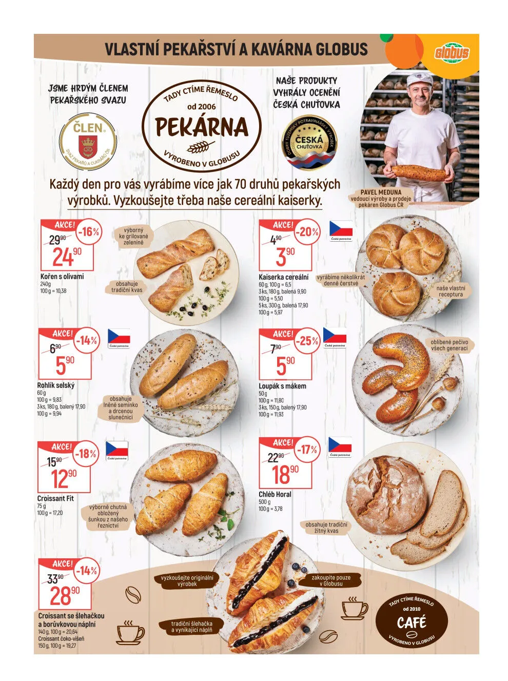 V našem vlastním pekařství a kavárně Globus pro vás každý den vyrábíme více než 70 druhů pekařských výrobků. Vyzkoušejte naše oblíbené cereální kaiserky, které jsou skvělou volbou pro každého.