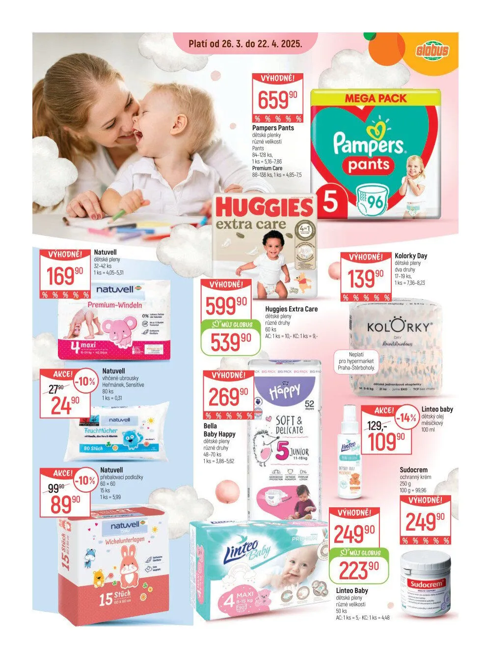 V letáku obchodu Globus najdete širokou nabídku dětských produktů, které potěší každého rodiče. Od 26. března do 22. dubna 2025 si můžete pořídit Pampers Pants v různých velikostech, včetně mega packů a varianty Premium Care. Dále jsou v akci dětské pleny Bella Baby Happy a Huggies Extra Care, které nabízejí komfort a ochranu pro vaše nejmenší.