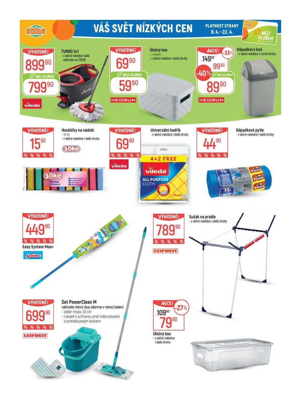 V letáku obchodu Globus najdete širokou nabídku výhodných produktů, které potěší každého zákazníka. Platnost akční nabídky je od 9.4. do 22.4. Mezi hlavními položkami se objevují úložné boxy a odpadkové koše, které jsou nyní v akci se slevou až 33%.