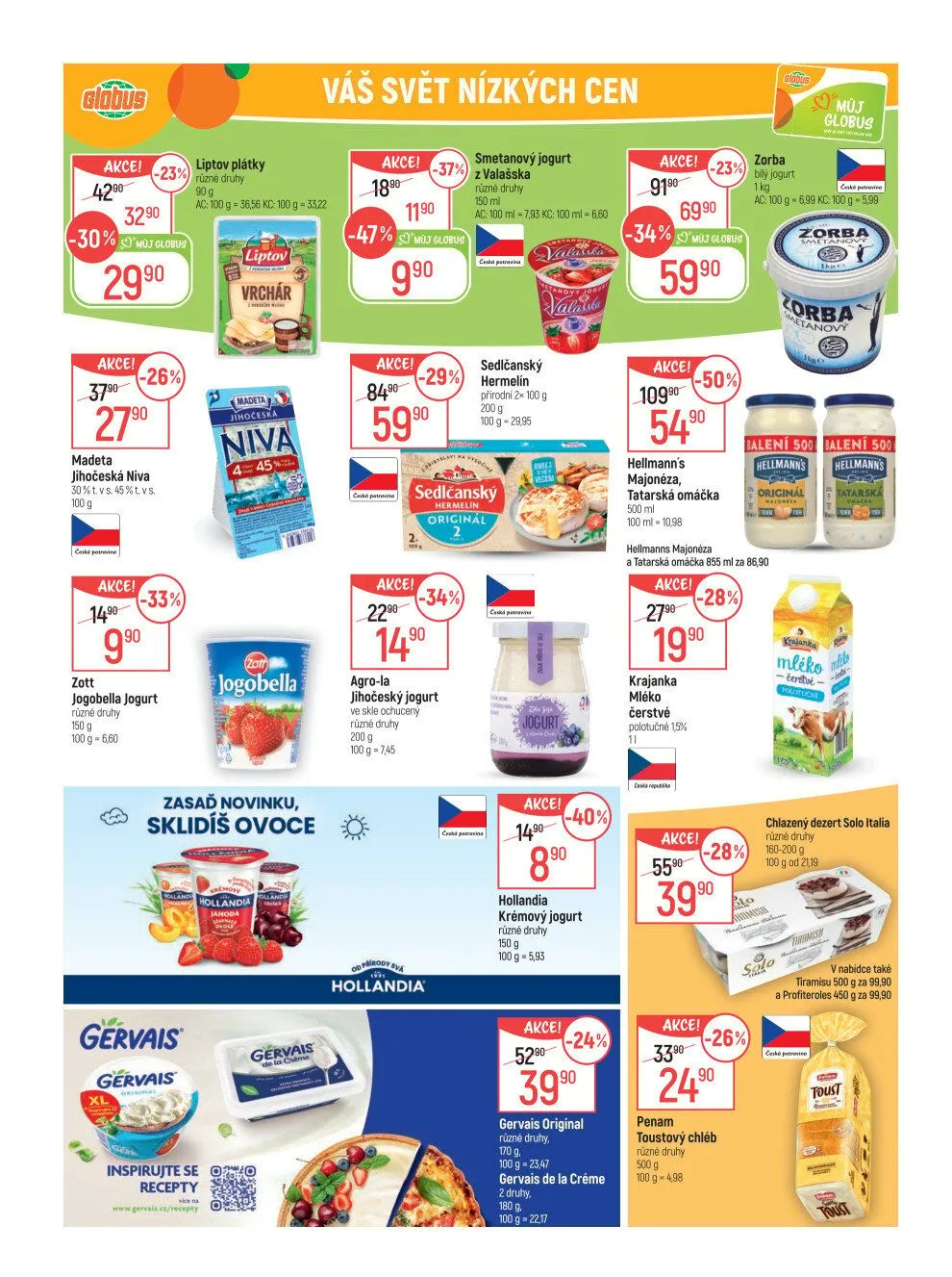 Zajímavé akce zahrnují jihočeskou nivu od Madety se slevou 30%, smetanový jogurt Zott Jogobella v různých druzích, a Sedlčanský hermelín.