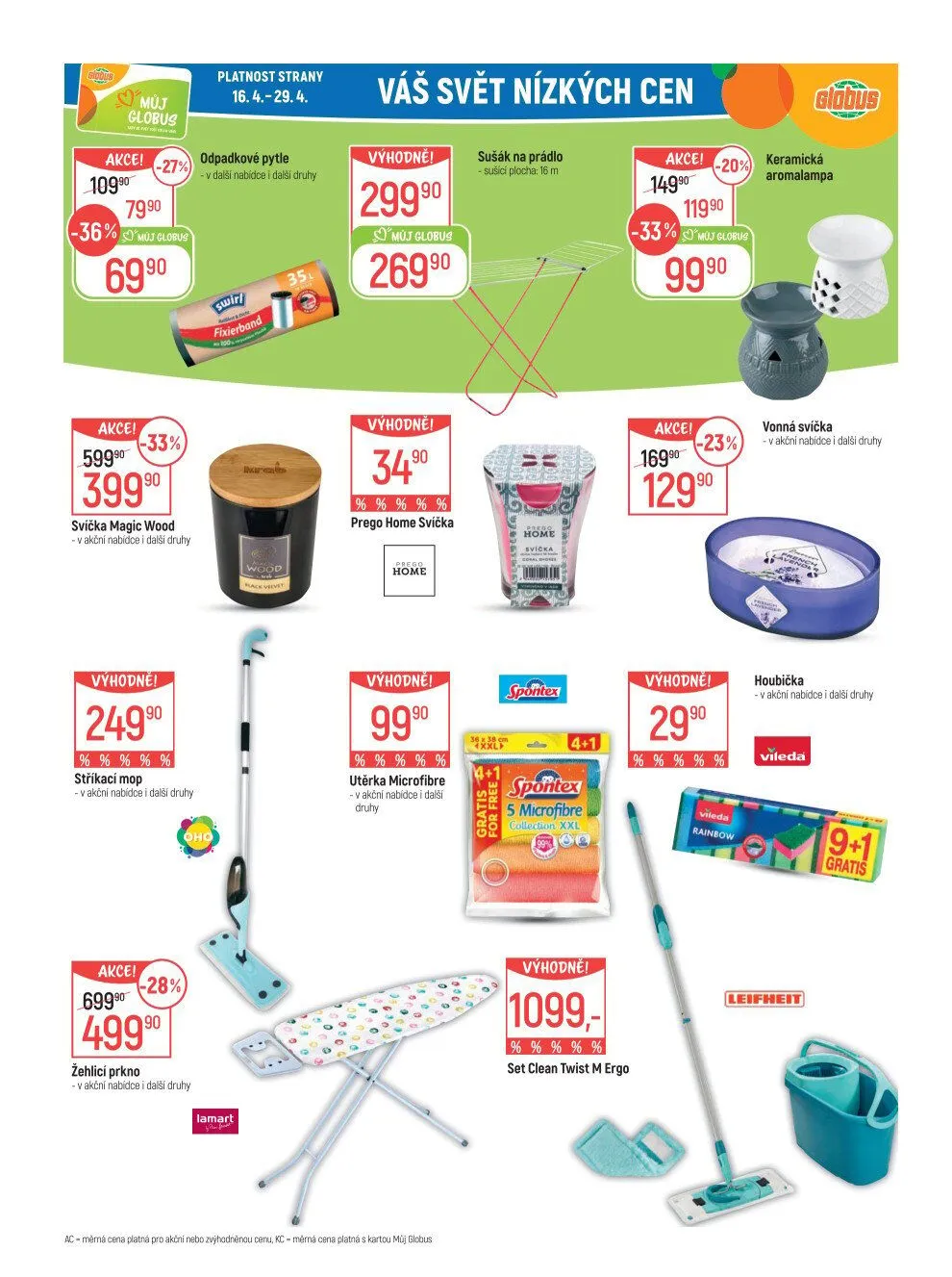 V letáku obchodu Globus na období od 16.4. do 29.4. najdete širokou nabídku výhodných produktů. Mezi nimi jsou odpadkové pytle za skvělou cenu 79,90 Kč, svíčka Magic Wood za 249,90 Kč a stříkací mop za 499,90 Kč. Nezapomeňte také na žehlicí prkno, které je v akční nabídce za 299,90 Kč.