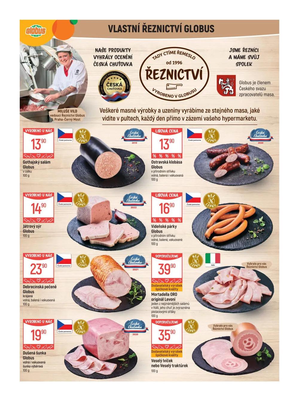 V letáku obchodu Globus najdete širokou nabídku kvalitních masných výrobků a uzenin, které jsou vyráběny přímo v zázemí hypermarketu. Naše řeznictví ctí tradiční řemeslo a od roku 1996 získává ocenění za kvalitu.
